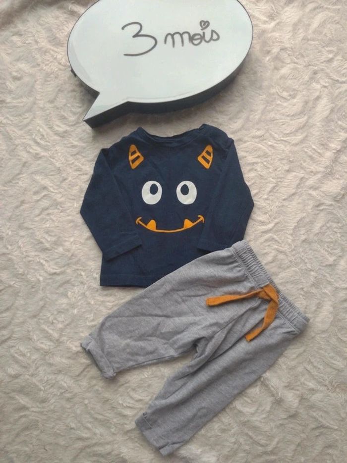 Ensemble (tee shirt manches longues+jogging) Garçon 3 mois Petit monstre In Extenso