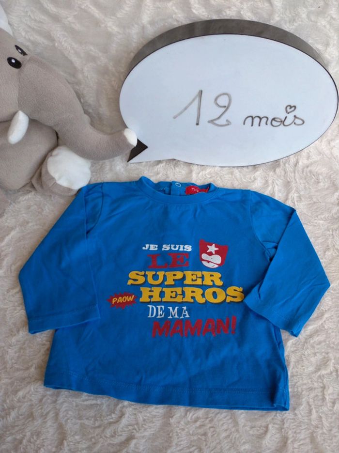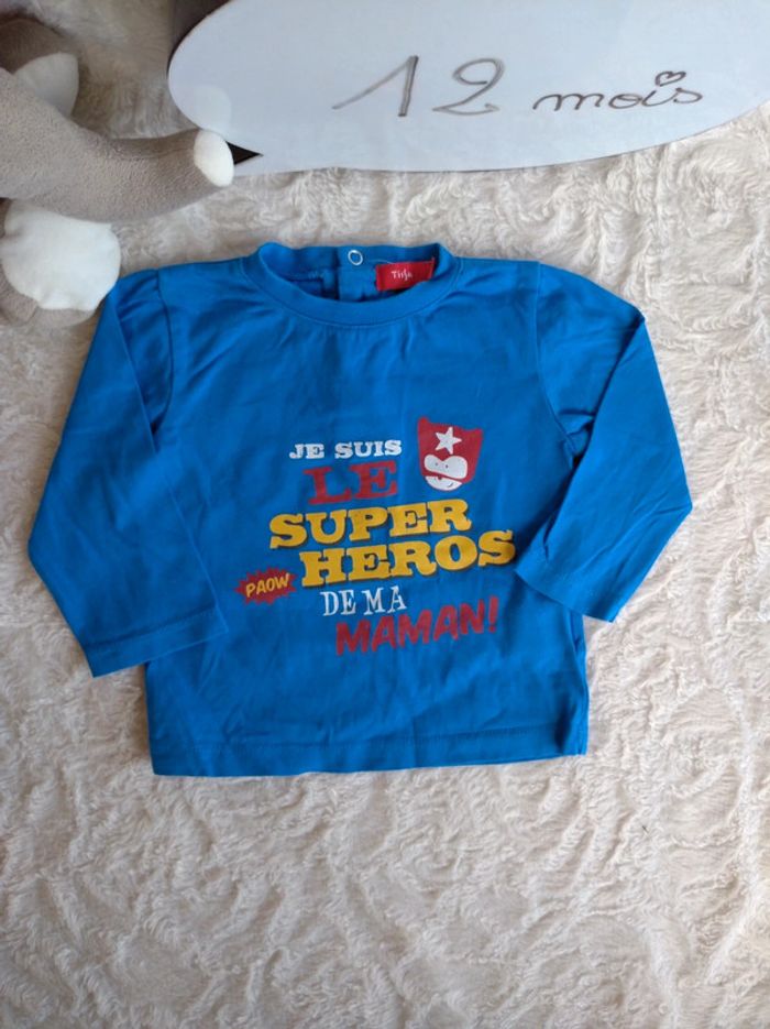 Tee shirt chemise manches longues Garçon 12 mois Super héro de ma maman Tissaia 100% coton