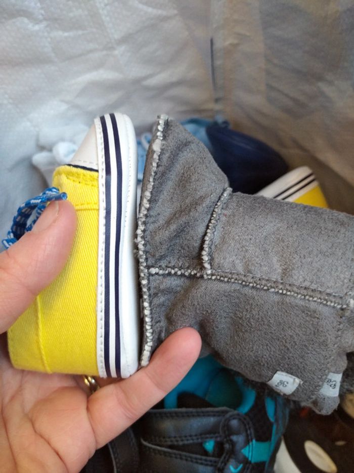 Très bon état. Je crois que la marque c'est la compagnie des petits (cf la cie indiqué derrière). Pour la taille, j'ai comparé avec une autre chaussure dont la taille indiquée est 17/18 (voir la dernière photo). Ouverture à l'aide de scratch sur le côté. #nathatfcMixteChaussures #nathatfcFilleChaussures #nathatfcGarçonChaussures