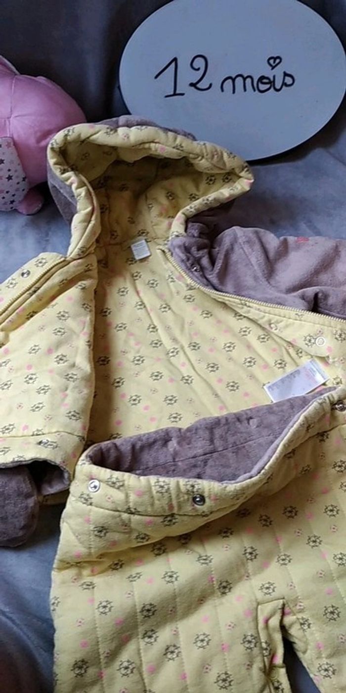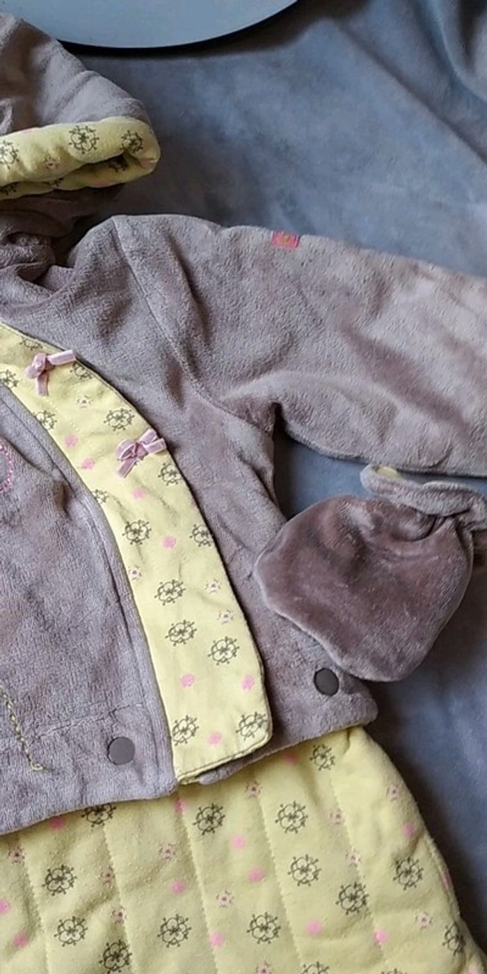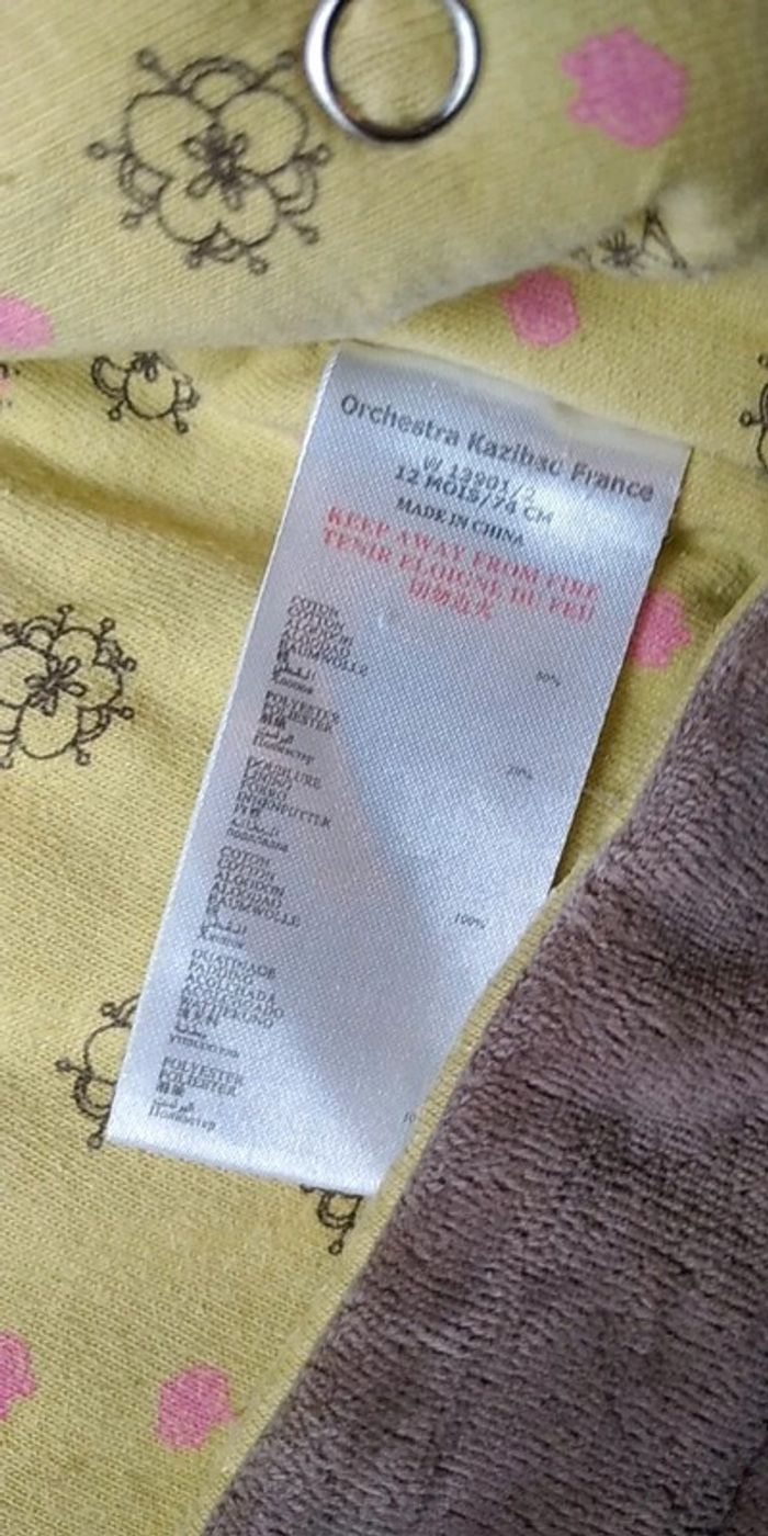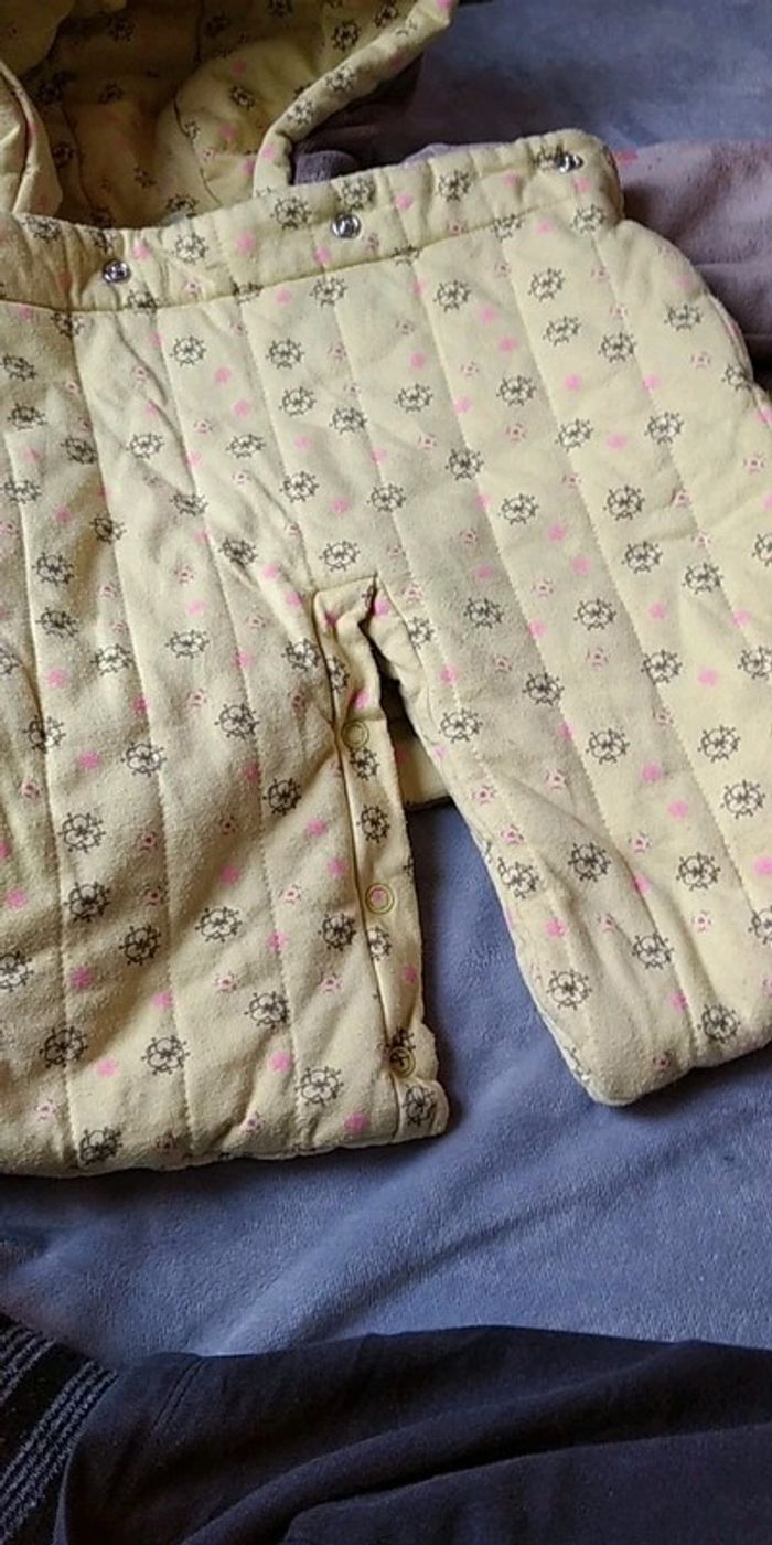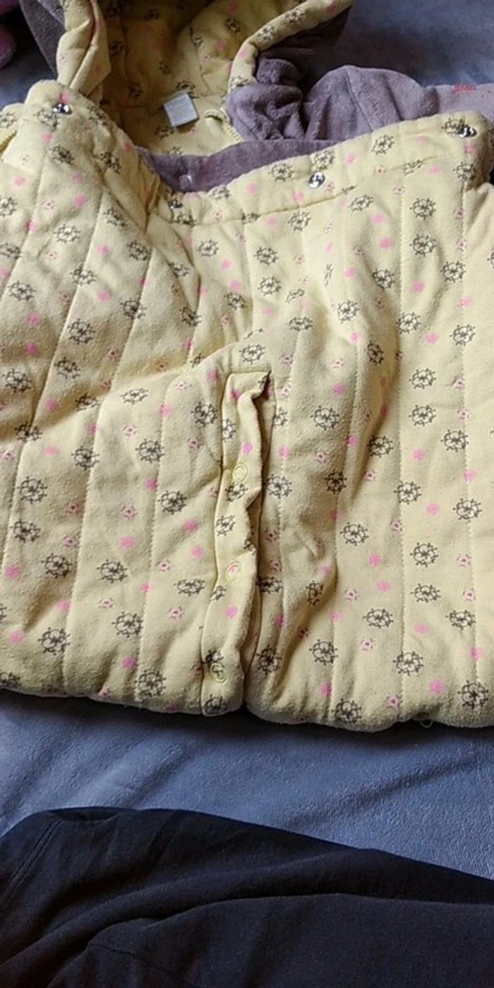 Bon état car porté plusieurs fois, partie jaune un peu pelucheuse (voir photos). Gants attachables avec une pression. Deux positions pour le bas, soit sous forme de pantalon pour laisser la place à la ceinture par exemple soit sous forme de bas de gigoteuse. #nathatfcFille12mois