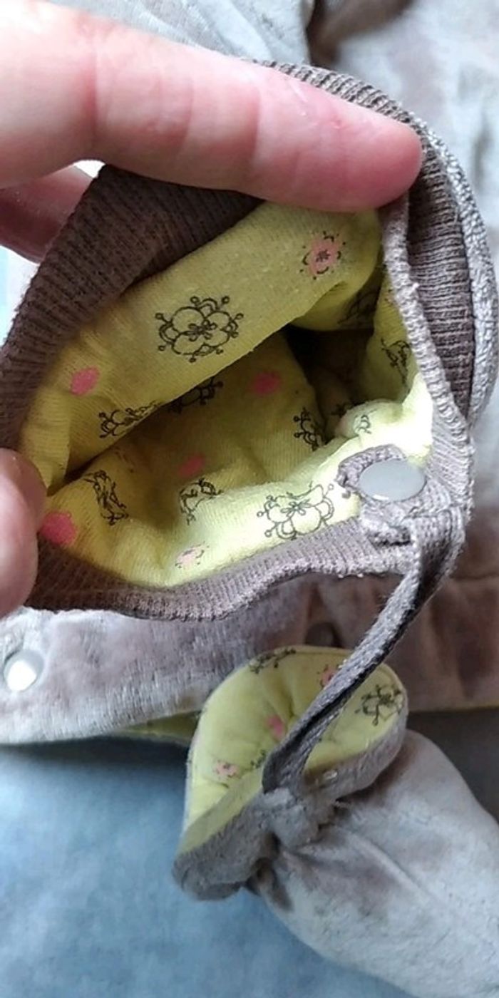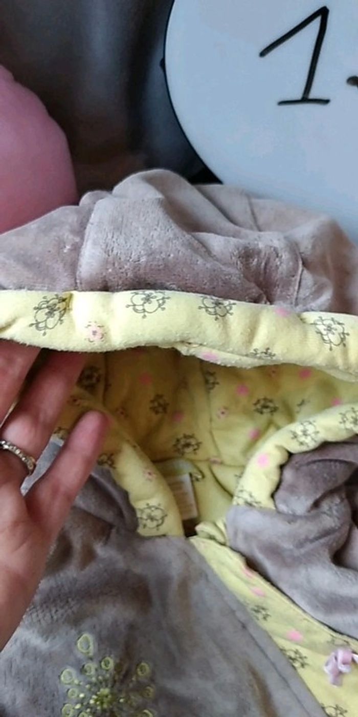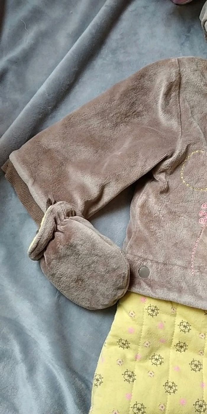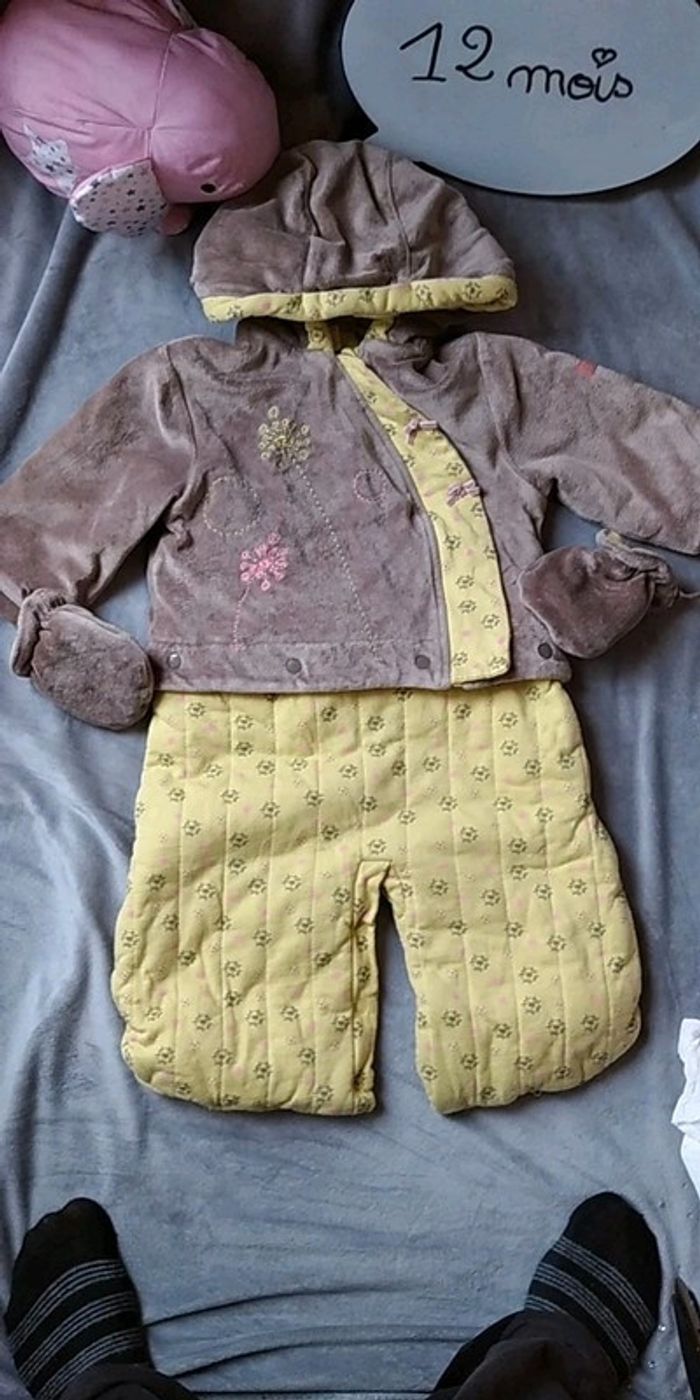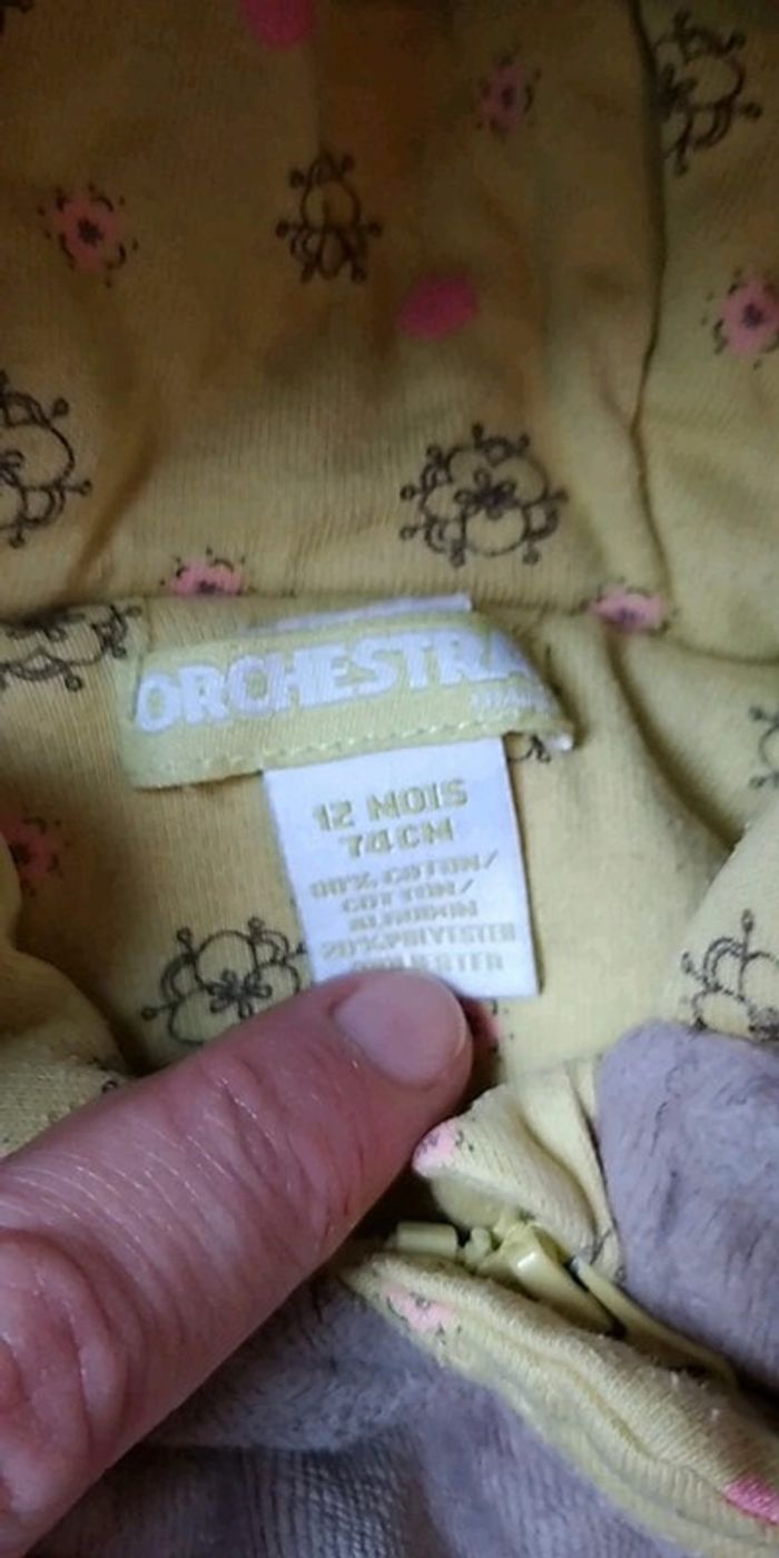Bon état car porté plusieurs fois, partie jaune un peu pelucheuse (voir photos). Gants attachables avec une pression. Deux positions pour le bas, soit sous forme de pantalon pour laisser la place à la ceinture par exemple soit sous forme de bas de gigoteuse. #nathatfcFille12mois