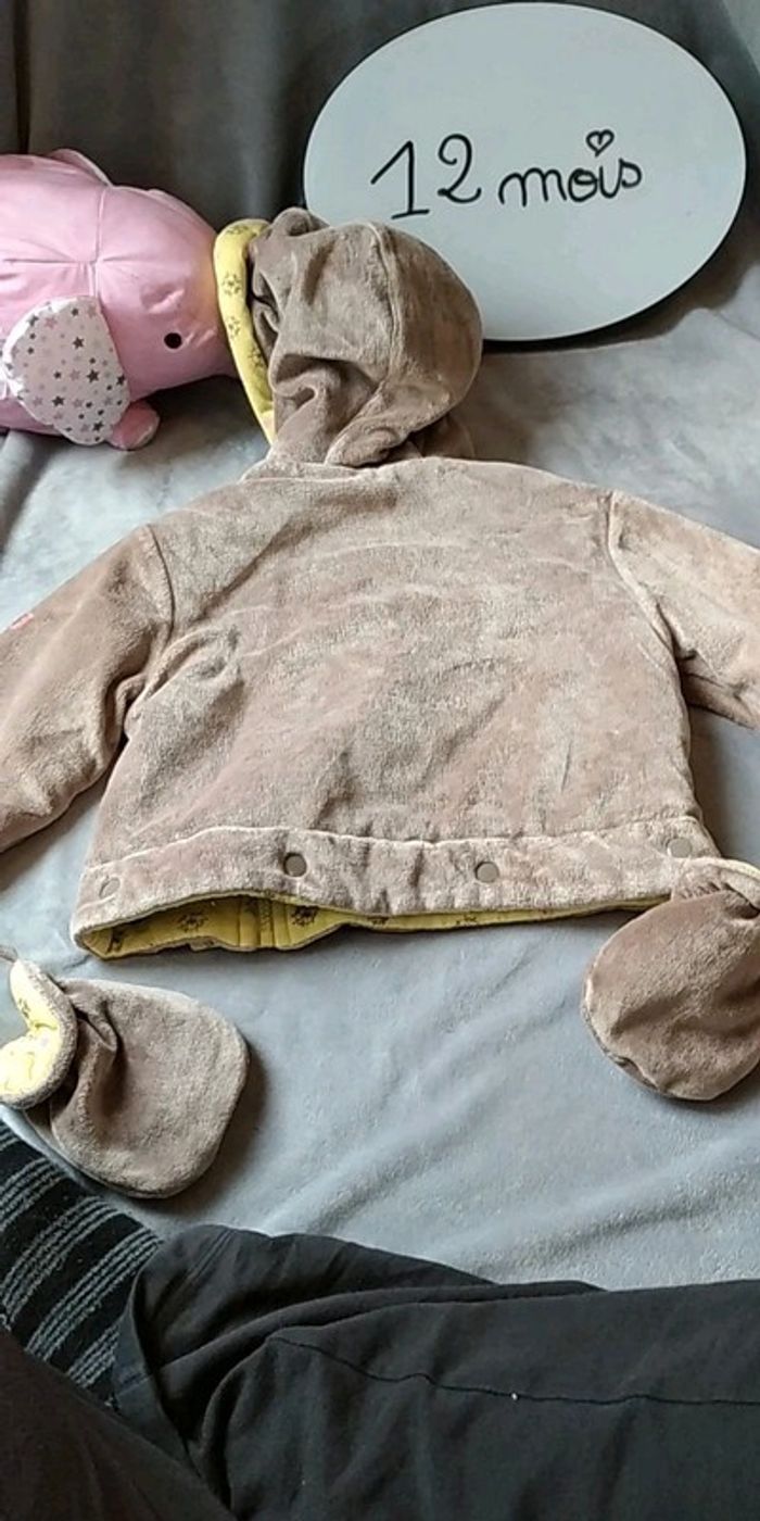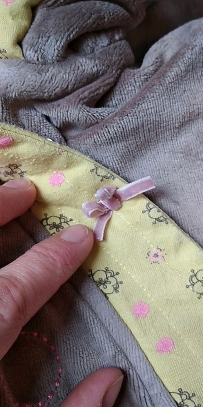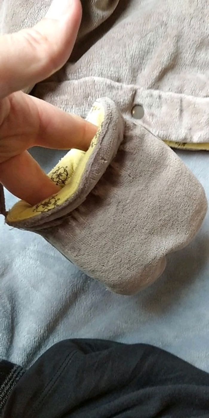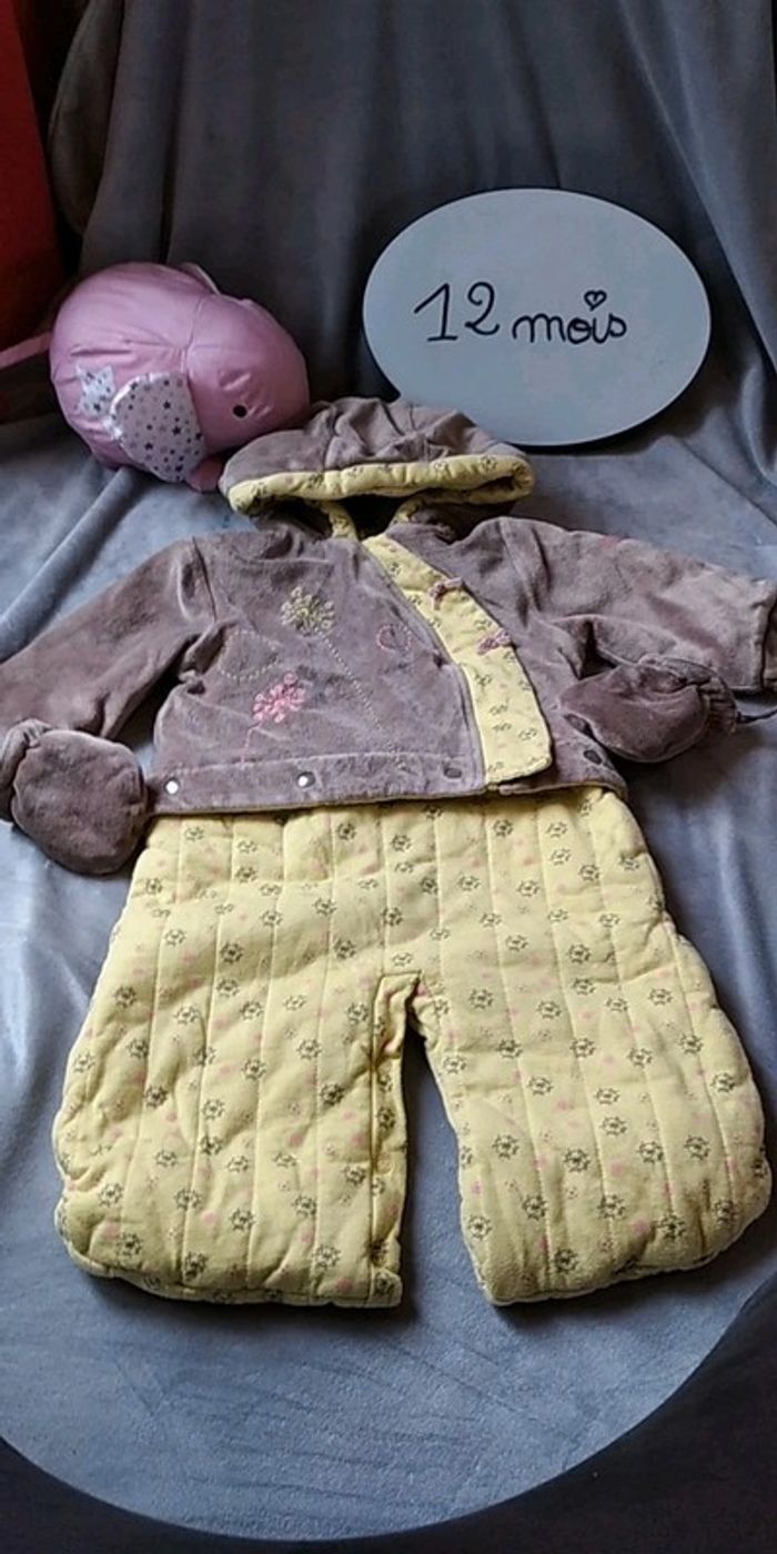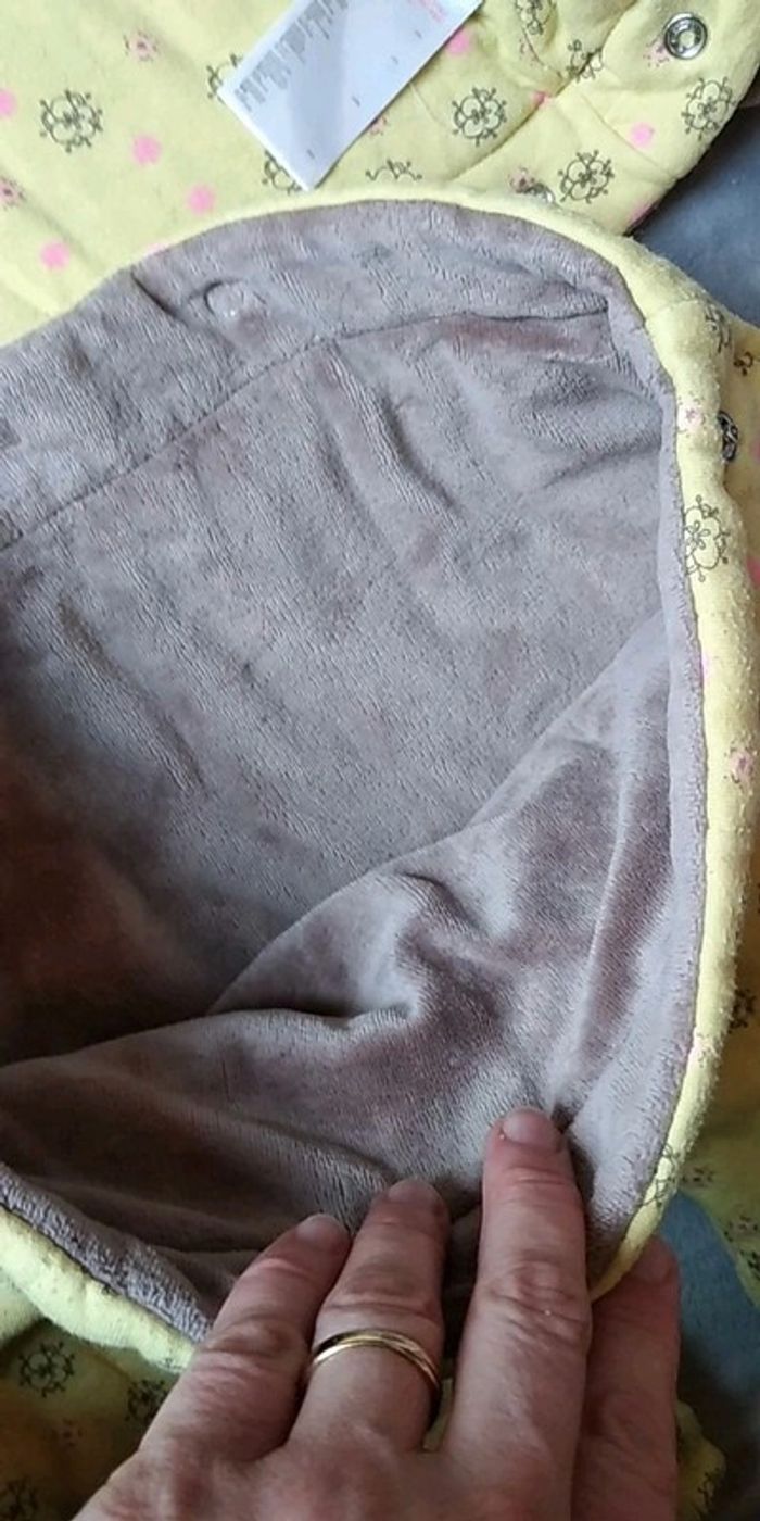 Bon état car porté plusieurs fois, partie jaune un peu pelucheuse (voir photos). Gants attachables avec une pression. Deux positions pour le bas, soit sous forme de pantalon pour laisser la place à la ceinture par exemple soit sous forme de bas de gigoteuse. #nathatfcFille12mois