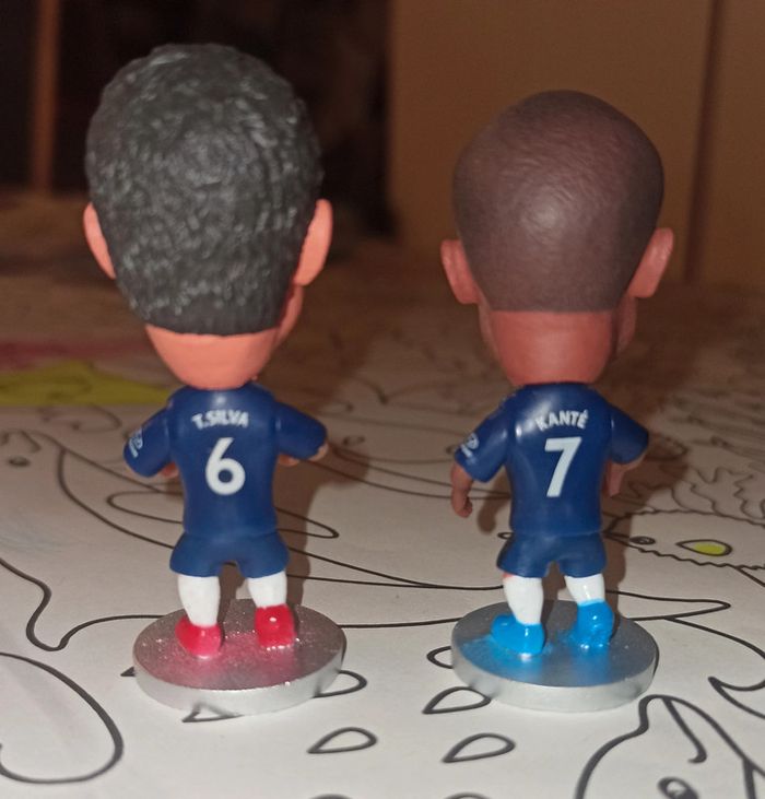 Lot de 2 petites figurines de foot du club de Chelsea Figurines football neuves avec emballage Ngolo Kante Thiago Silva 6-7cm environ sur socle J'ai également d'autres joueurs (Messi Neymar Mbappé haaland Lewandowski Benzema Ronaldo Cr7 R9 Ronaldinho Zidane Henry etc) d'autres clubs (PSG real Madrid fc Barcelone Inter et Milan AC As Rome Juventus Naples Bayern Tottenham Arsenal Chelsea Manchester United et City) et pays (France Portugal Brésil argentine Belgique) etc regardez mon dressing