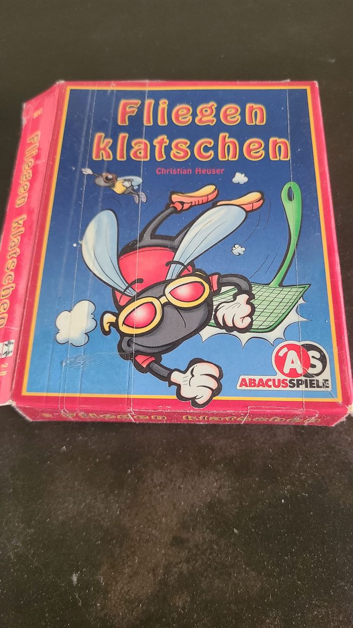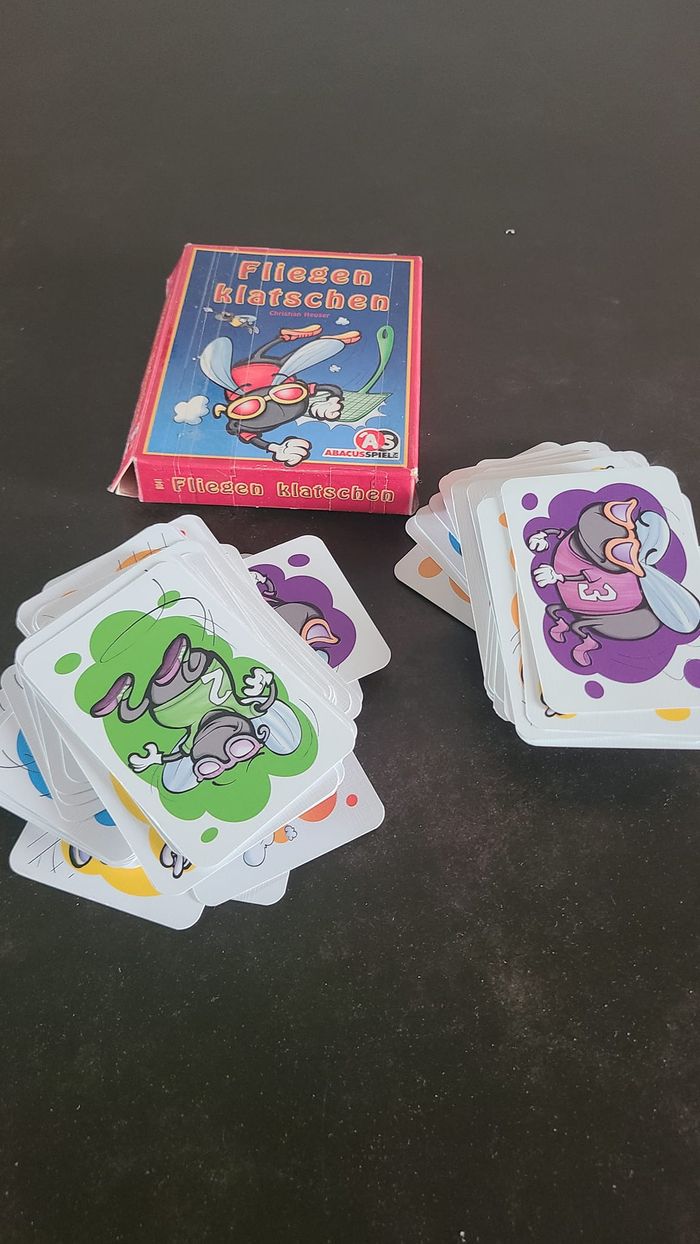 Fliegen klatschen ("PAF la mouche !") est un jeu d'action rapide aux règles simples. Les cartes représentent des mouches aux différentes valeurs (de 1 à 5), 16 de chaque couleur (bleu, rouge jaune, vert, violet, orange), et 16 cartes "tapette à mouches". Les cartes sont réparties équitablement entre les joueurs. Chacun leur tour, les joueurs piochent une carte : - si c'est une carte "mouche", il la pose, face visible, sur la table. Au fur et à mesure du jeu, les cartes suivantes ne devront pas couvrir les cartes déjà posées. - si c'est une "tapette à mouches", les joueurs peuvent attraper des mouches. - si c'est une mouche d'une cinquième couleur (quatre couleurs différentes éaient déjà visibles) qui est posée, c'est l'équivalent d'une carte "tapette à mouches". On attrape les mouches en plaquant la main dessus. Détail important : on attrape les mouches uniquement de la couleur la plus présente. Si on se trompe, on remet sous sa pioche sa dernière mouche gagnée. S'il y a deux mains sur une même mouche, c'est le joueur le plus rapide qui l'emporte. Chaque joueur additionne les points de ses mouches gagnées, celui qui en a le plus est le vainqueur. S'il y a égalité, c'est celui qui a en sa possession le plus grand nombre de cartes.