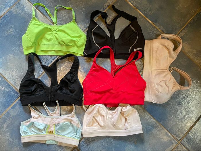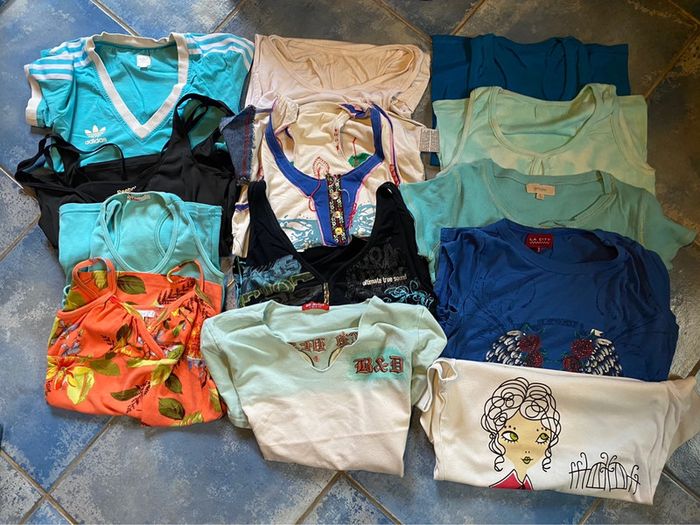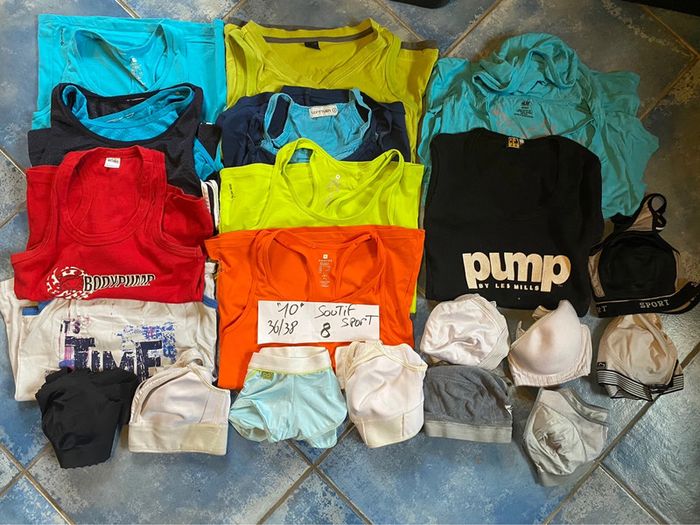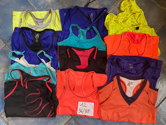 Lot de vêtements de sport : beaucoup de tee shirt avec brassière intégré et soutif renforcer Et tee shirt pour zoomba ou sport en salle Tout est nikel en marque adidas décathlon reebock etc….