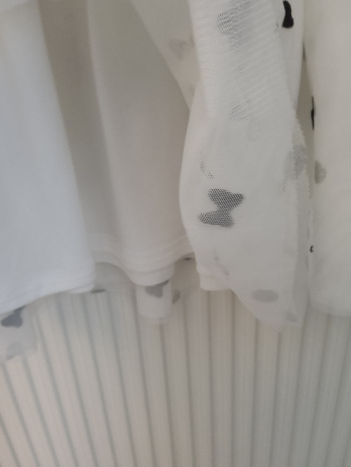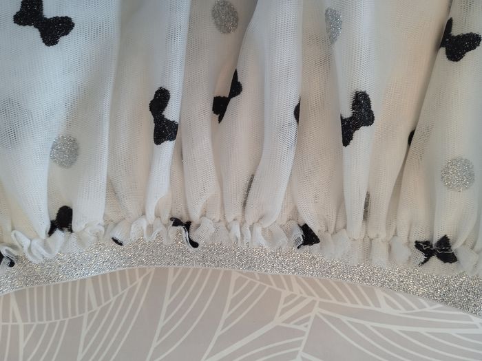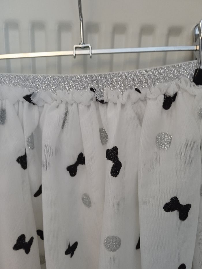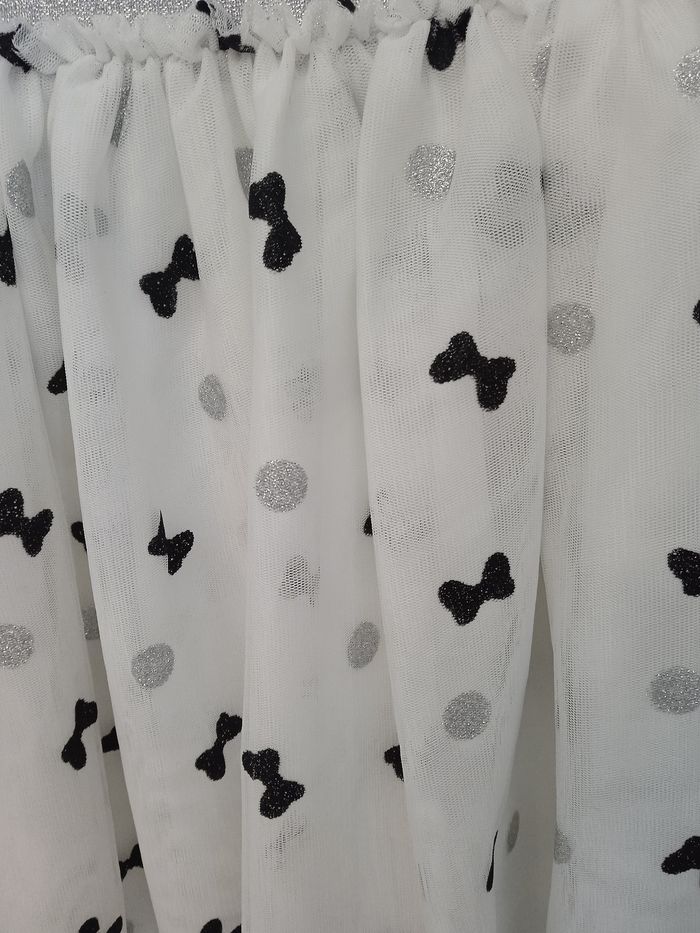 Jupe de couleur blanche sur le tulle motif rond argenté et noeud noir. Doublure en tissu Blanc. Marque Disney. Élastique à la taille non ajustable. #fille12ansnade3033