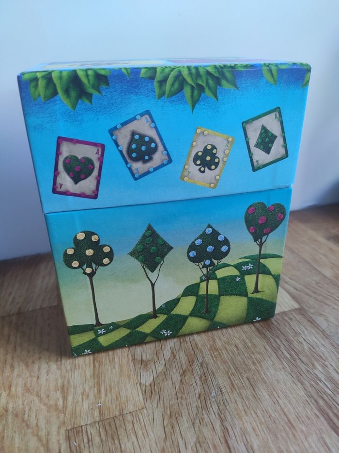 En carton solide. Dimensions 14,4 cm x 12 cm x 8,2 cm. En très bon état, jamais servie. J'ajoute des cartes cartonnées qui peuvent servir de marque-pages