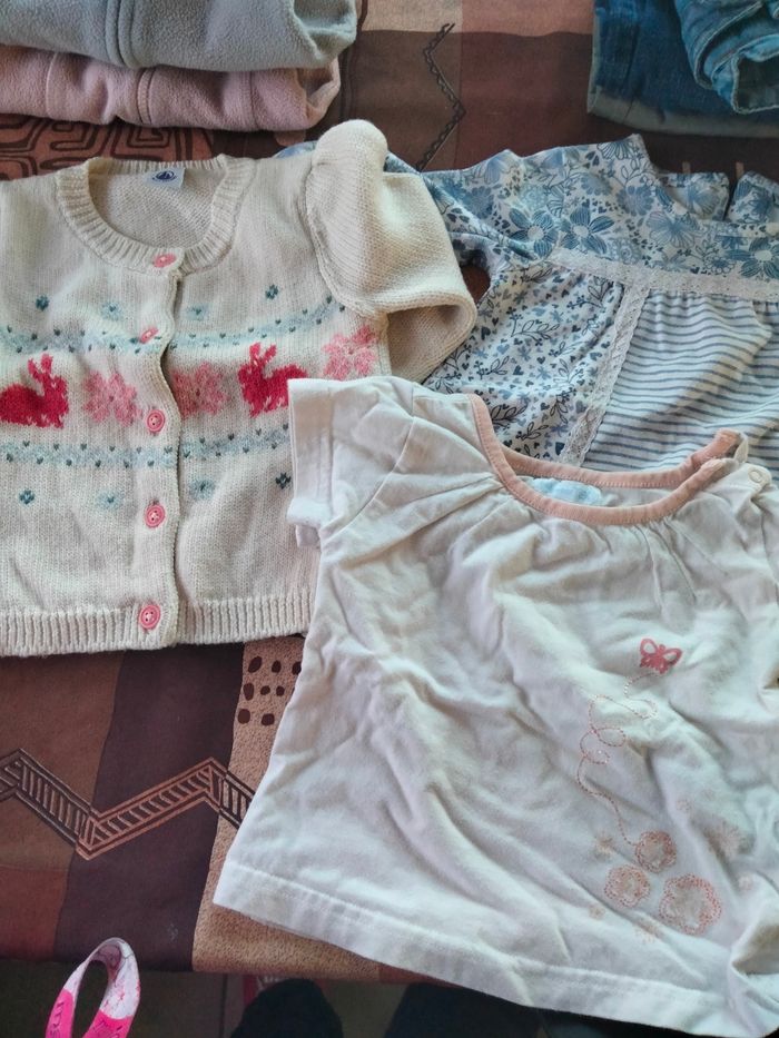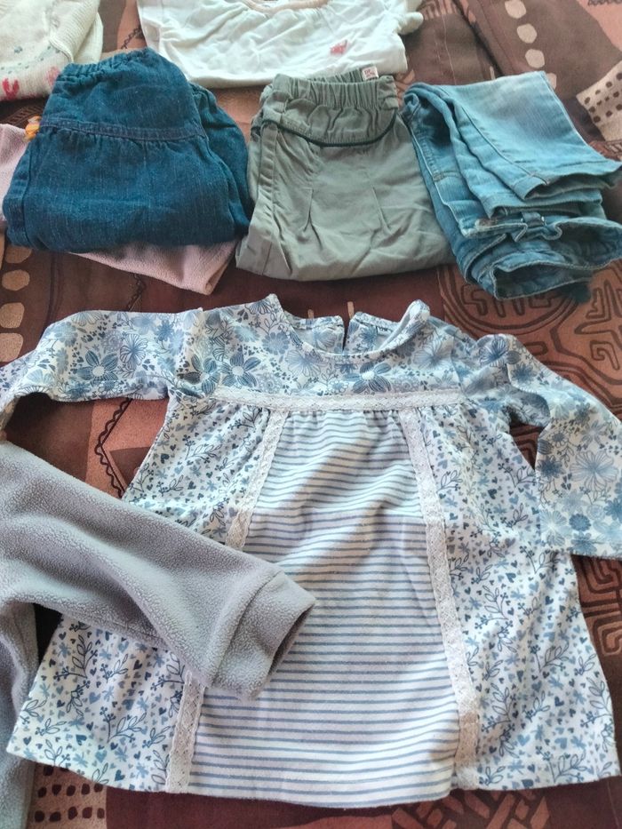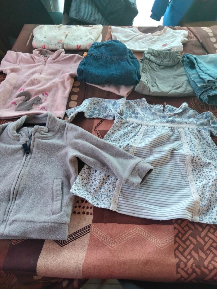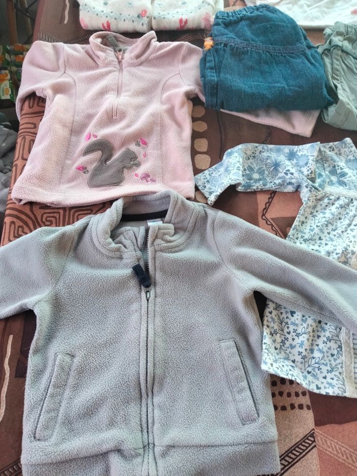 Lot 8 pièces 1robe 1t shirt 1gilet 1 veste grise polaire 1pull rose polaire 2jeans Un pantalon gris
