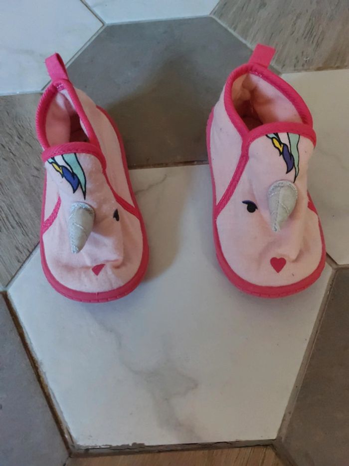 Je vends une paire de chaussons rose thème licorne avec une vraie corne de licorne au bout ! La semelle extérieure en caoutchouc est épaisse. Marque Tex en taille 21. Elles sont dans un bon état. #liloupinette_chaussures21