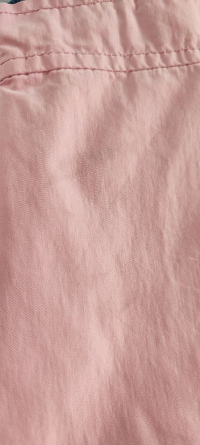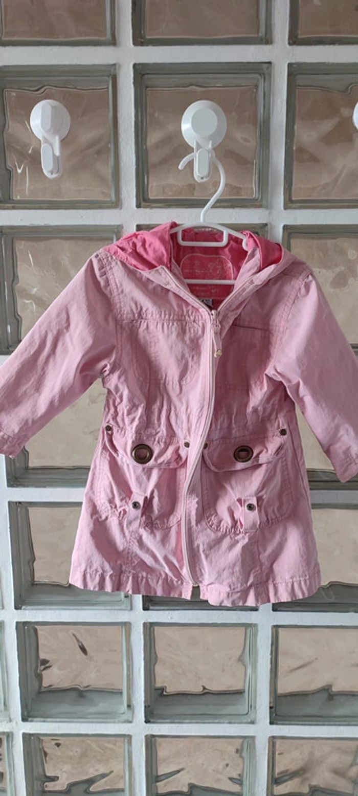 Parka rose Okaïdi 3 ans avec capuche. Il s'ajuste avec des cordes à tirer à la taille et se ferme avec une fermeture éclair. Tâches sur l'intérieur de la manche. #liloupinette_3ans