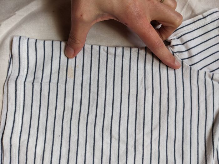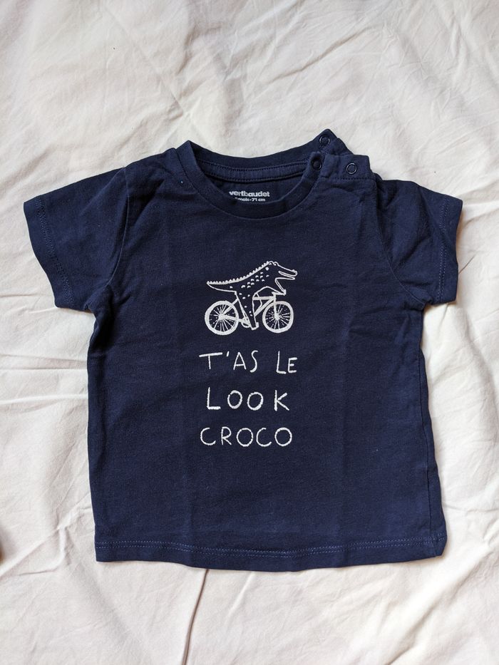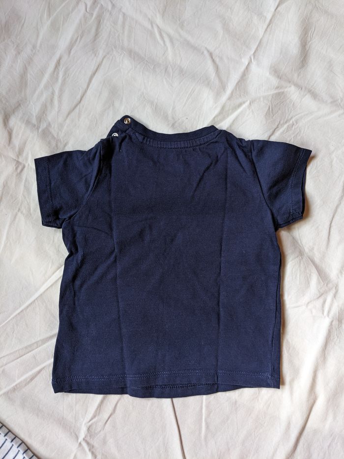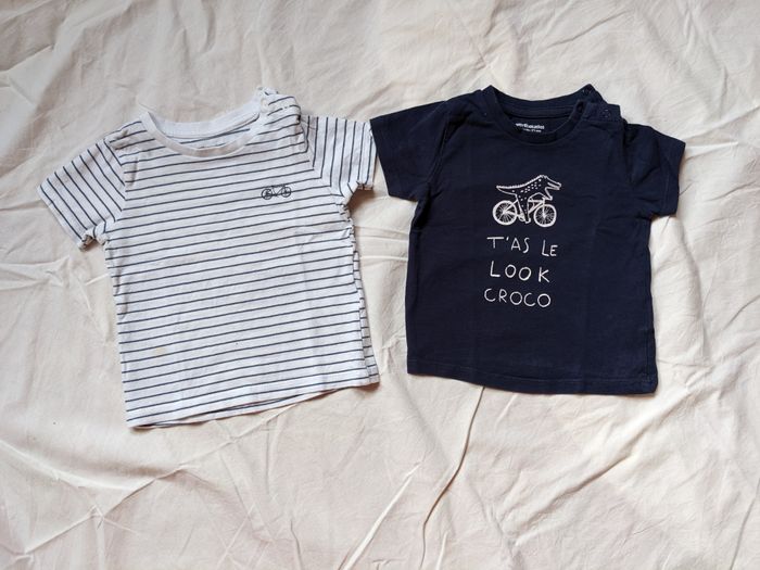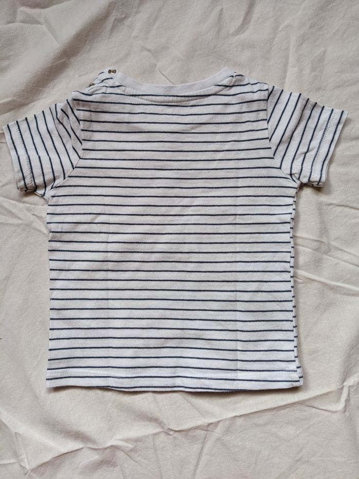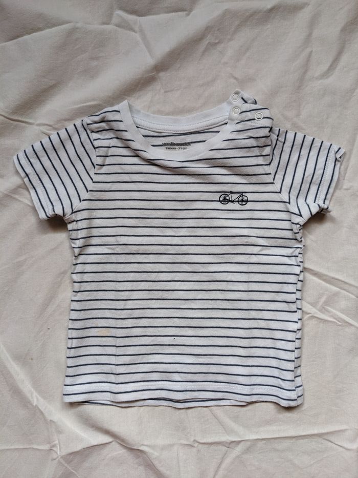 Lot de 2 T-shirts manches courtes Vertbaudet taille 9 mois : 1 blanc rayé bleu avec petites taches peu visibles (voir photo), 1 bleu marine en parfait état