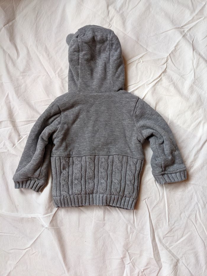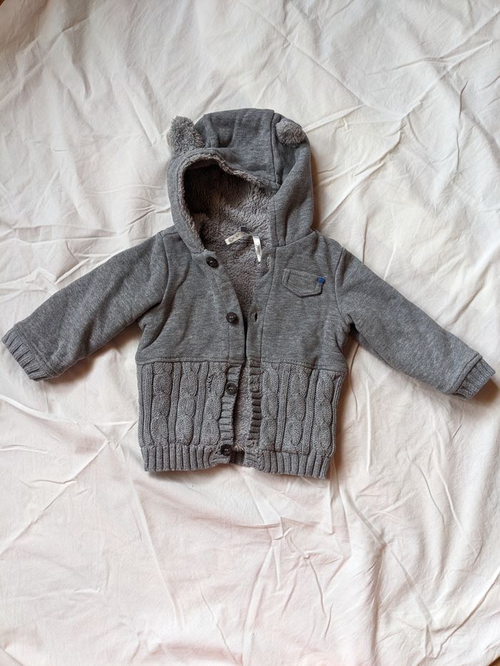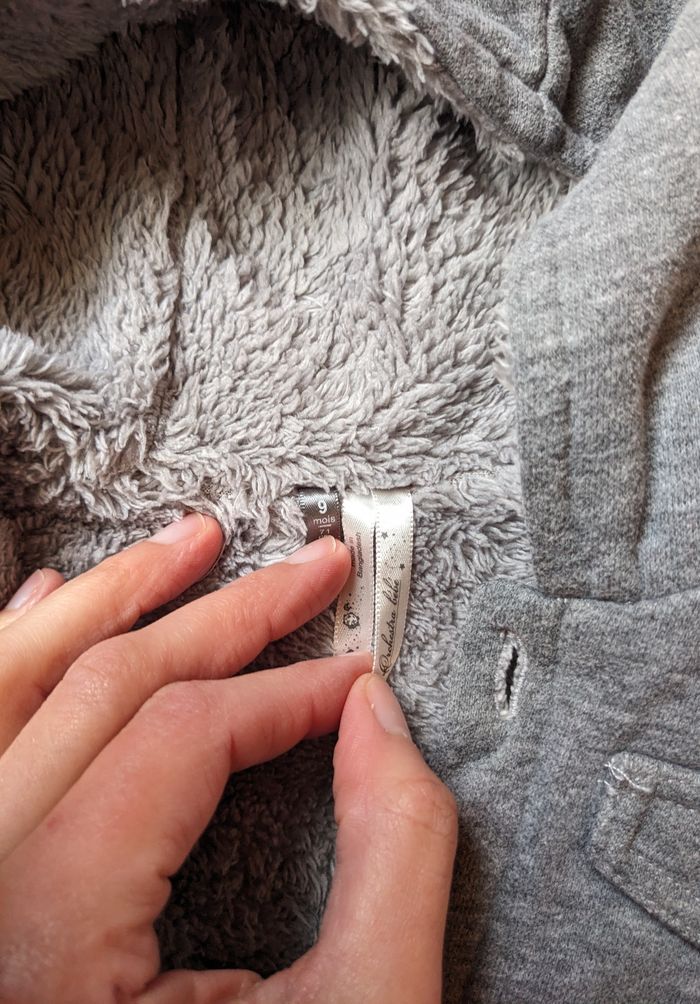 Gilet gris à capuche et petites oreilles, fermeture par boutons, pas imperméable mais doublé et bien chaud. Marque Orchestra bébé taille 9 mois. Parfait état, très peu porté