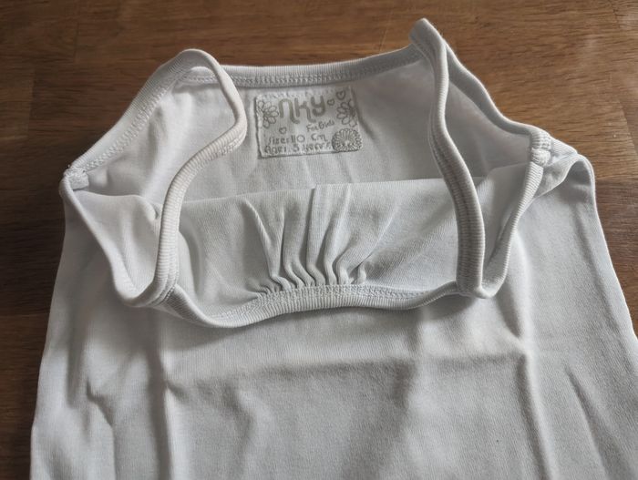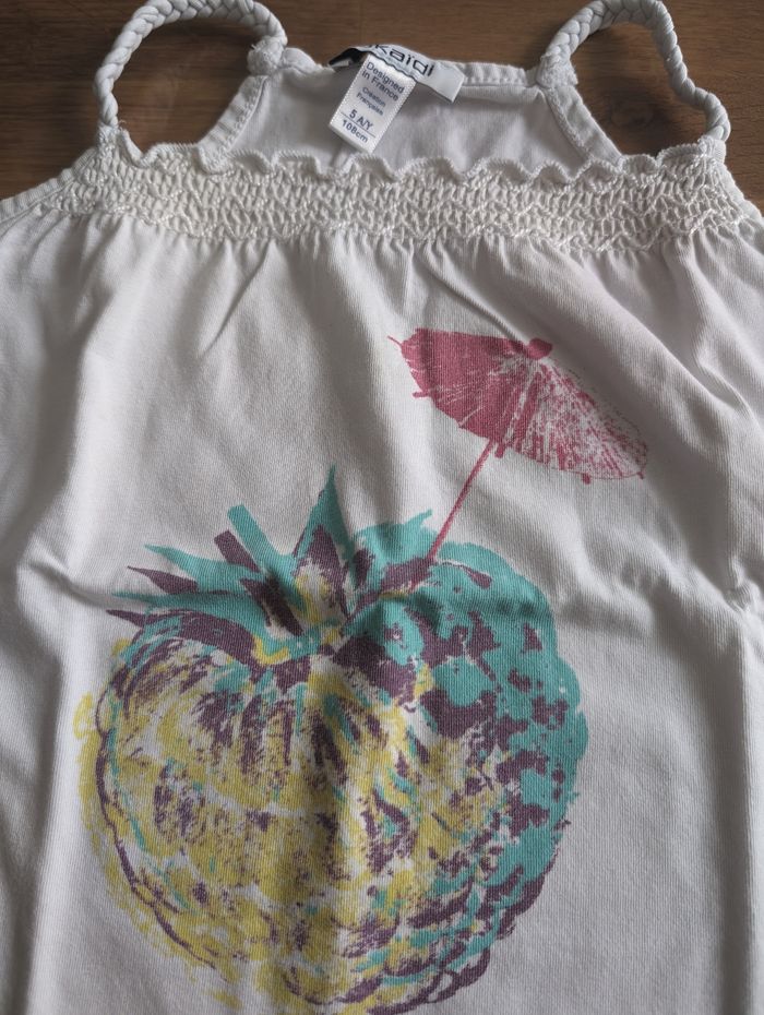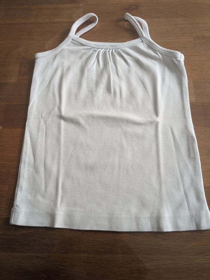 Lot de 2 débardeurs fille 5 ans État satisfaisant Blanc à motifs Okaïdi, des tâches sur le devant et une barre jaune au niveau des fils élastiques du devant Blanc sans motifs NKY une coloration au niveau des plis du devant.