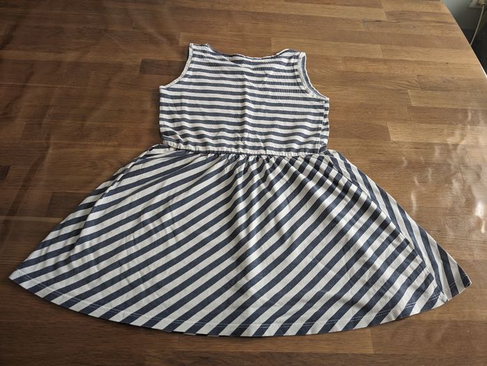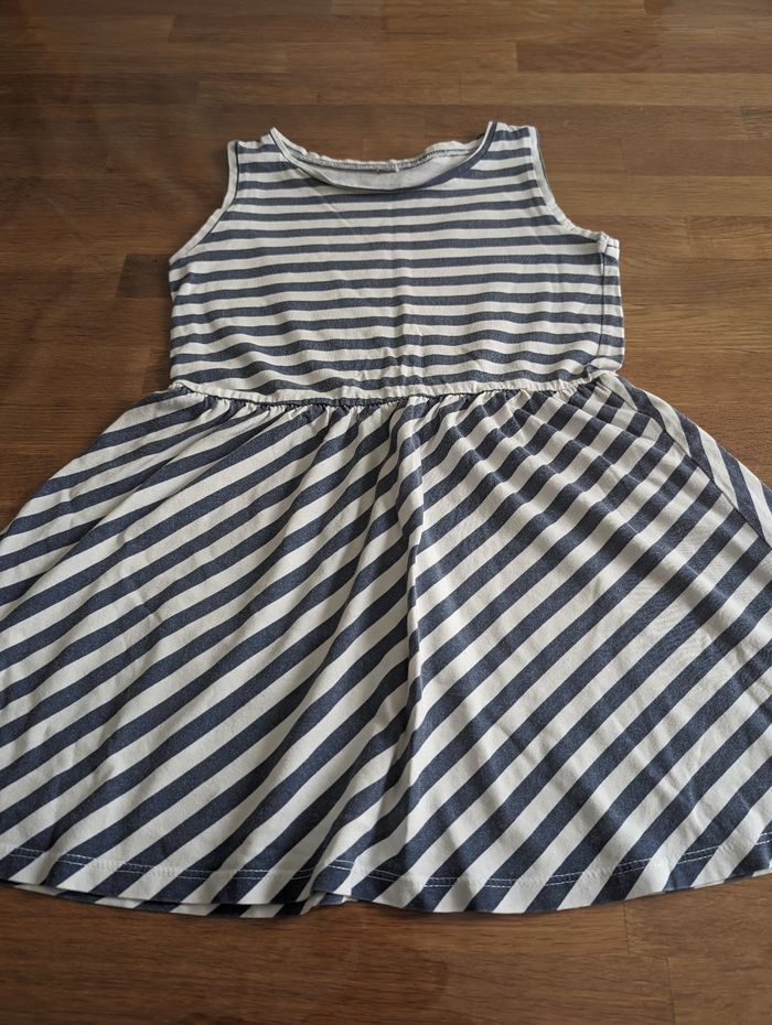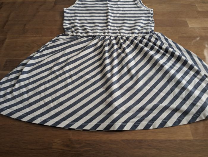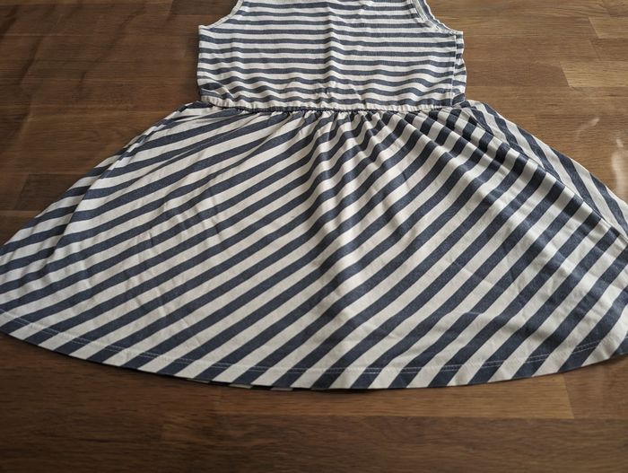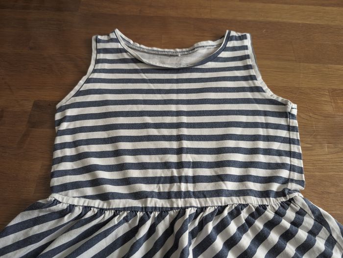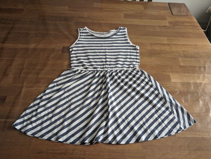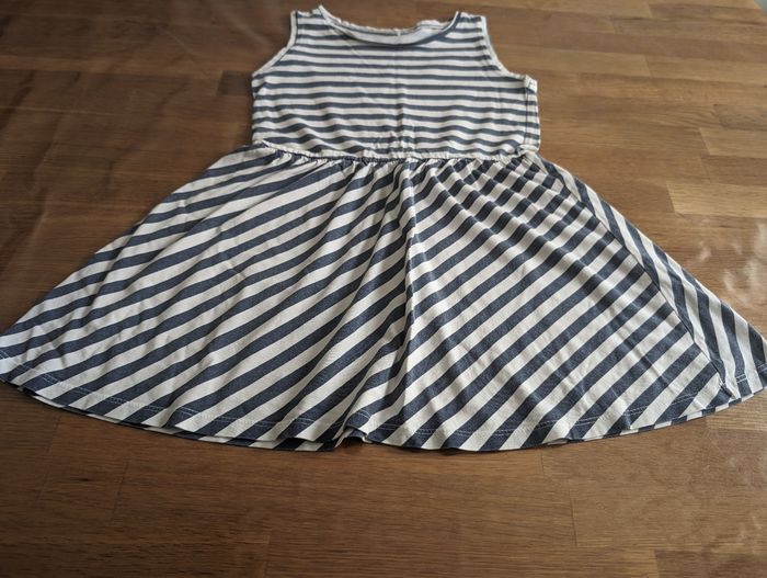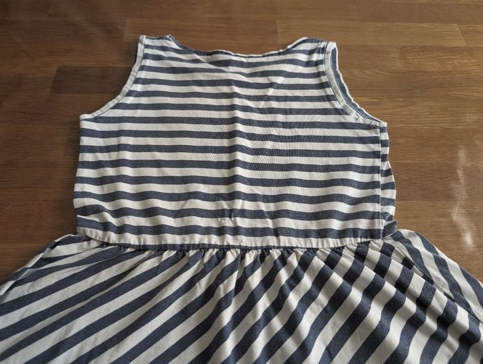 Robe fille environ 5 ans Beaucoup portée, blanc et bleu, couleurs passées, étiquettes absentes, la taille est donc une estimation, une tâche à l'arrière.