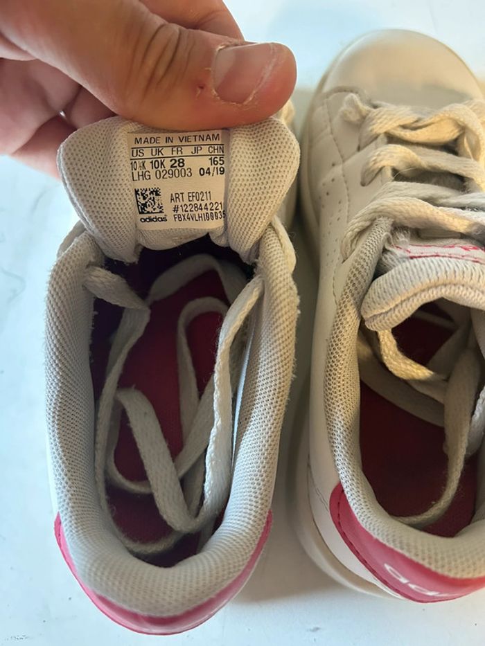 Baskets Adidas fille blanches et roses à lacets Pointure 28. Très bon état, tissu du milieu est quelque peu jauni avec l’usure