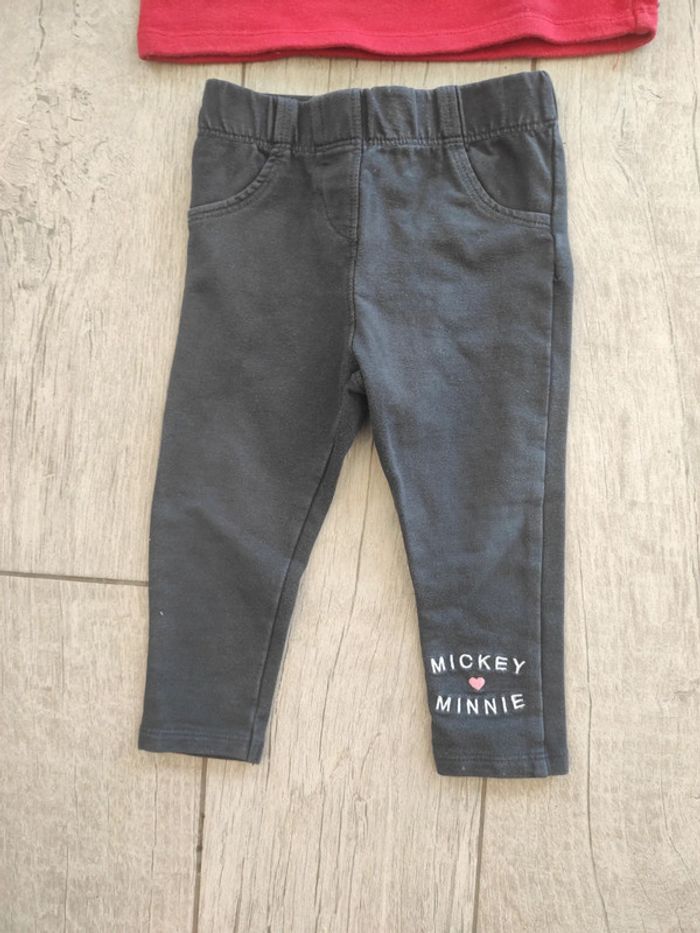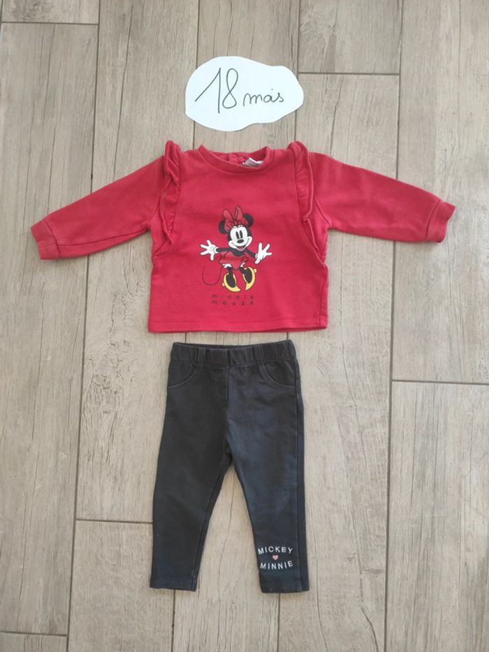 Ensemble fille d'hiver thème minie de Disney en 18 mois, composé d'un pull rouge avec Minnie et d'un pantalon gris foncé inscription "Mickey ❤️ Minnie". ‼️ À noter : un petit trou sur la couture du pantalon à recoudre ➡️ Réduction sur les lots