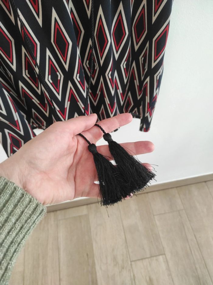 Débardeur bleu marine avec des motifs losanges rouges et blanc cassé, deux cordes et pompons. Dentelle dans le cou et sur les épaules. Taille M (taille large) ➡️ Réduction sur les lots (n'hésitez pas à parcourir mon dressing je vends d'autres vêtements femme y compris grossesse et allaitement)