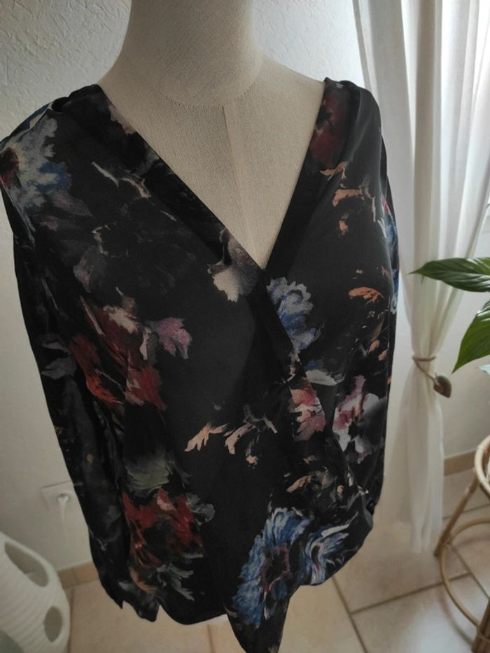 Jolie blouse qui fait habillée, légèrement transparente à motif fleurs. Taille 38. Parfait état