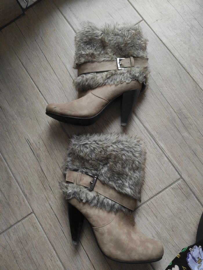Bottine à talon avec moumoute, pointure 38. Voir photo pour traces d'usure, ont été bien portées ✅ Pour filtrer par taille : aller dans "chercher" puis taper mon pseudo et mettre les filtres souhaités ✅ Réduction automatique dès 5 articles ✅ Négociation possible sur les lots