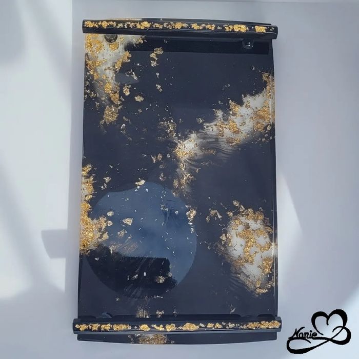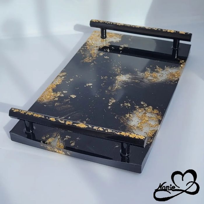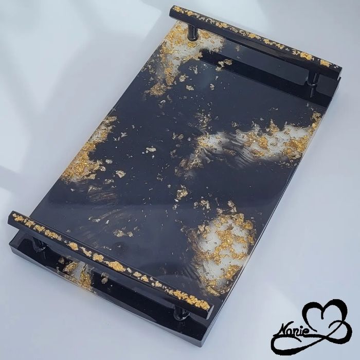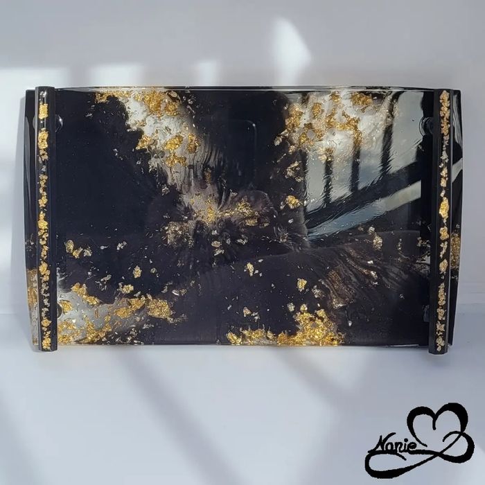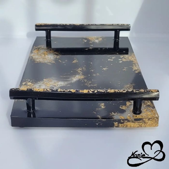 Ce plateau avec des anses noir et doré, en résine époxy, est unique et fait main.