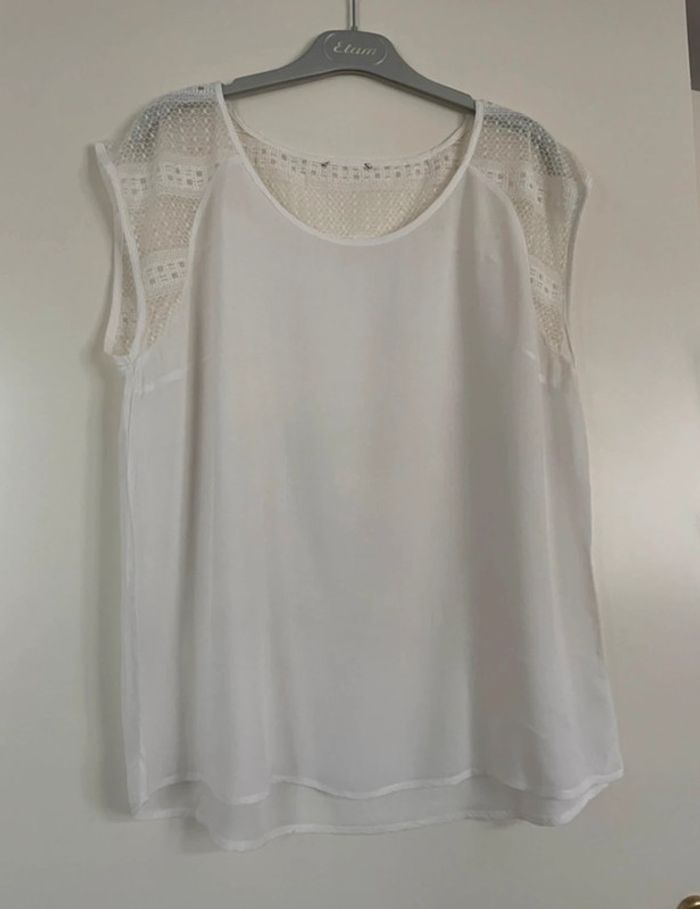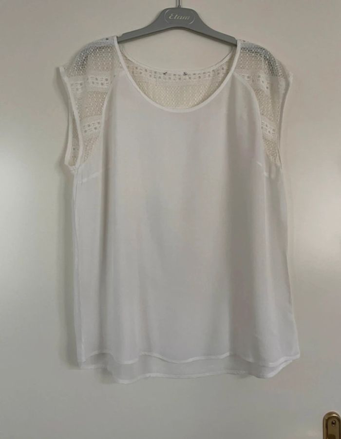 Chemisier blanc fluide avec manches et dos en dentelles transparentes. #yessiitaille42