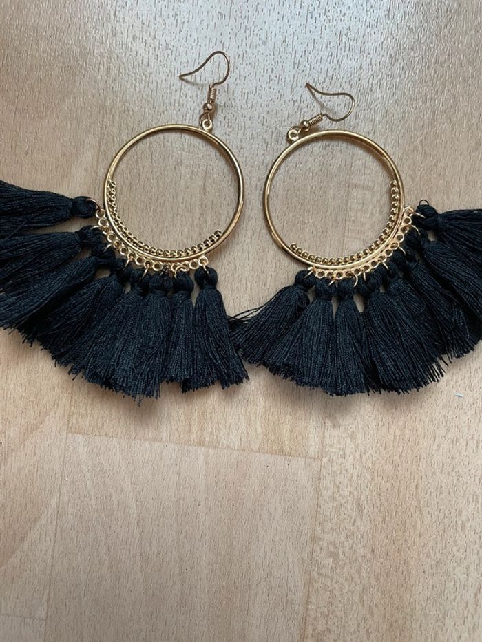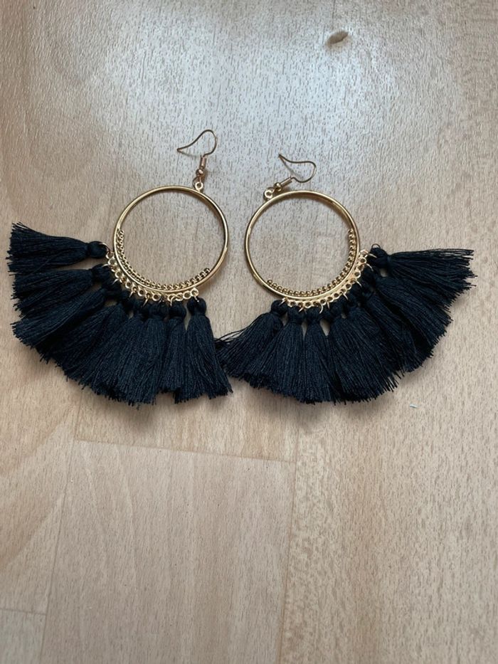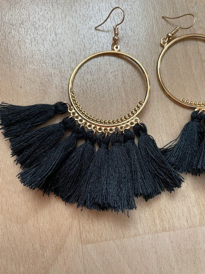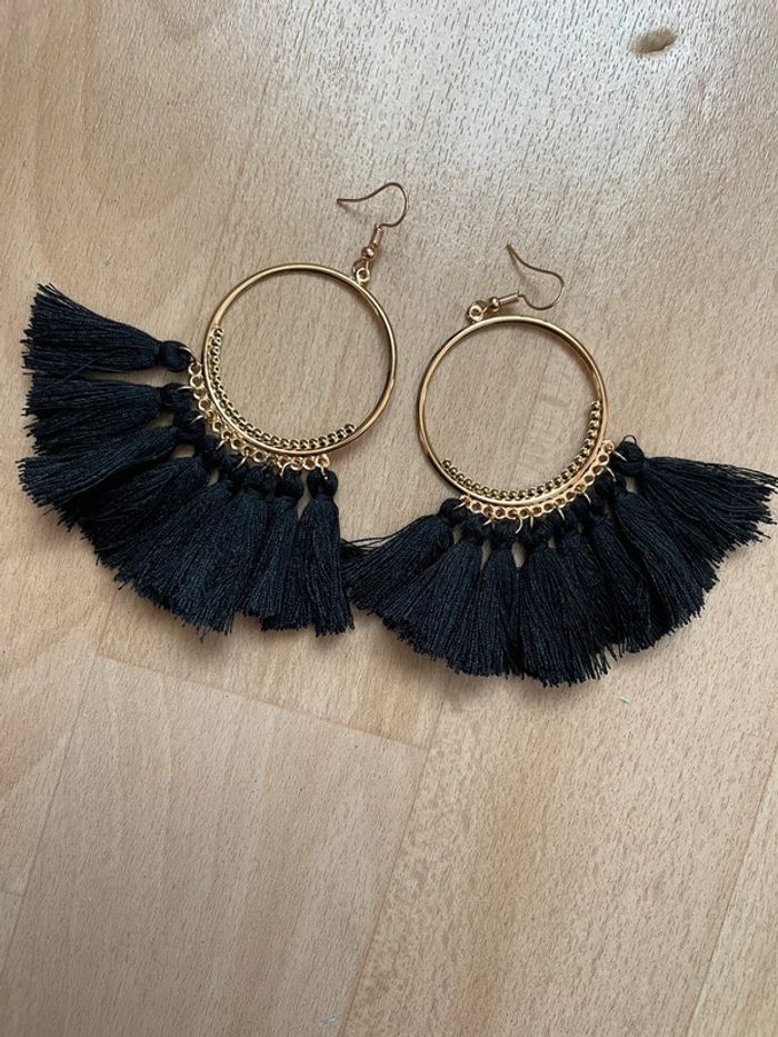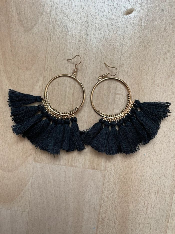 Boucles d’oreilles dorées à pompons noirs. #yessiibijoux