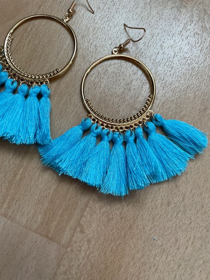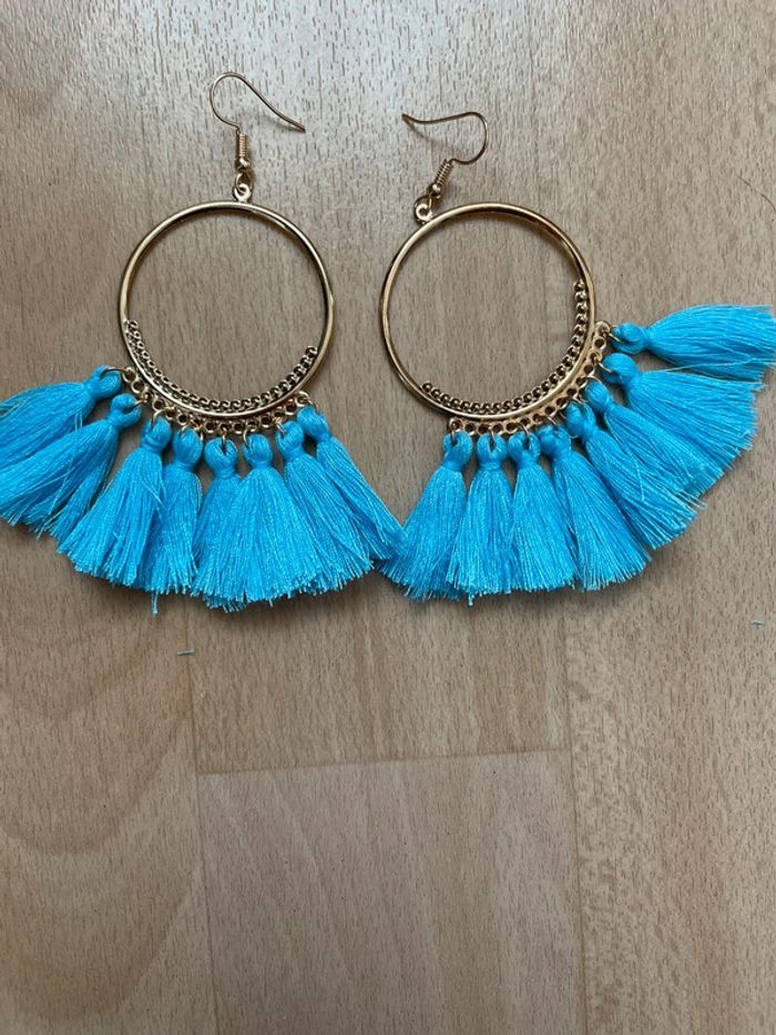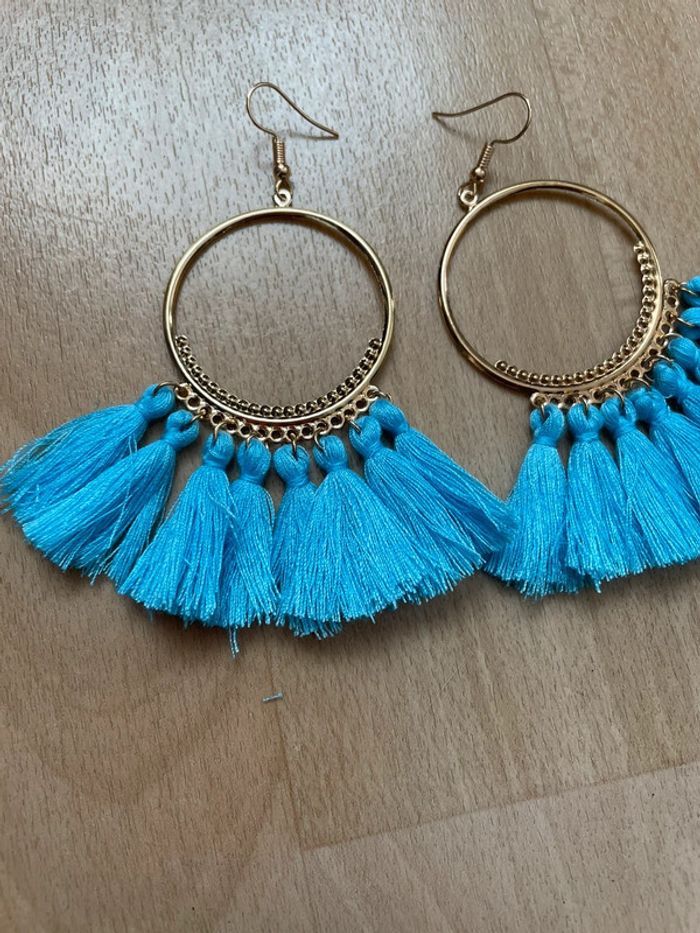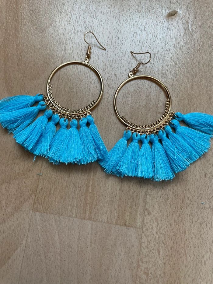 Boucles d’oreilles dorées à pompons bleus. #yessiibijoux