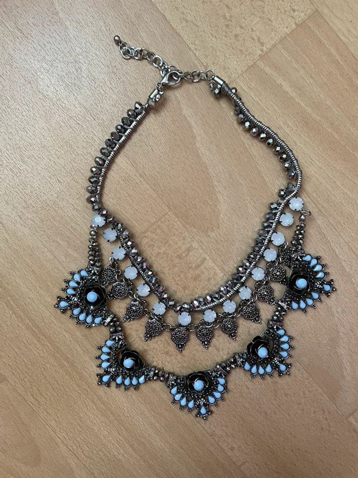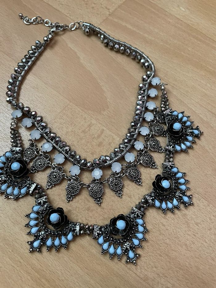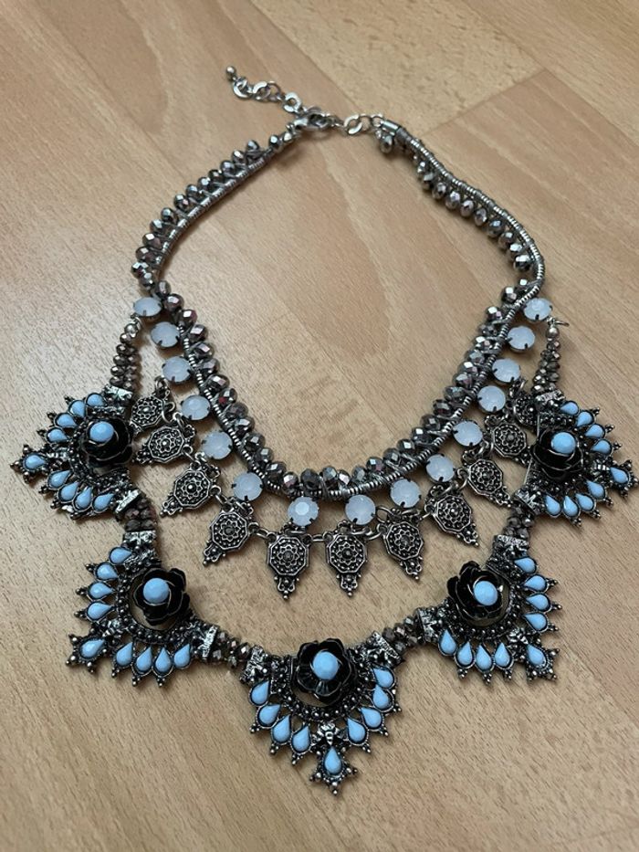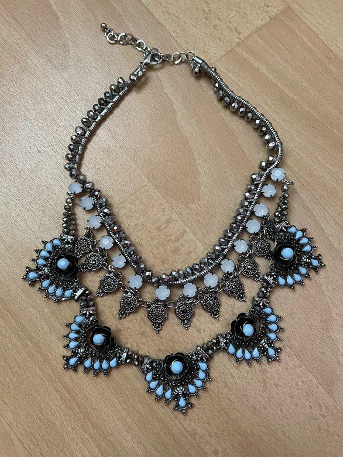 Collier plastron argenté avec perles bleues. #yessiibijoux