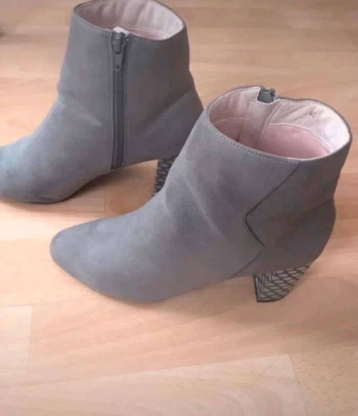 Bottines grises effet daim, talons imprimés de 7,5cm.