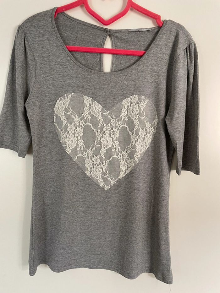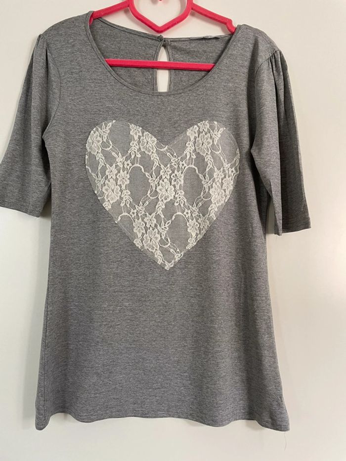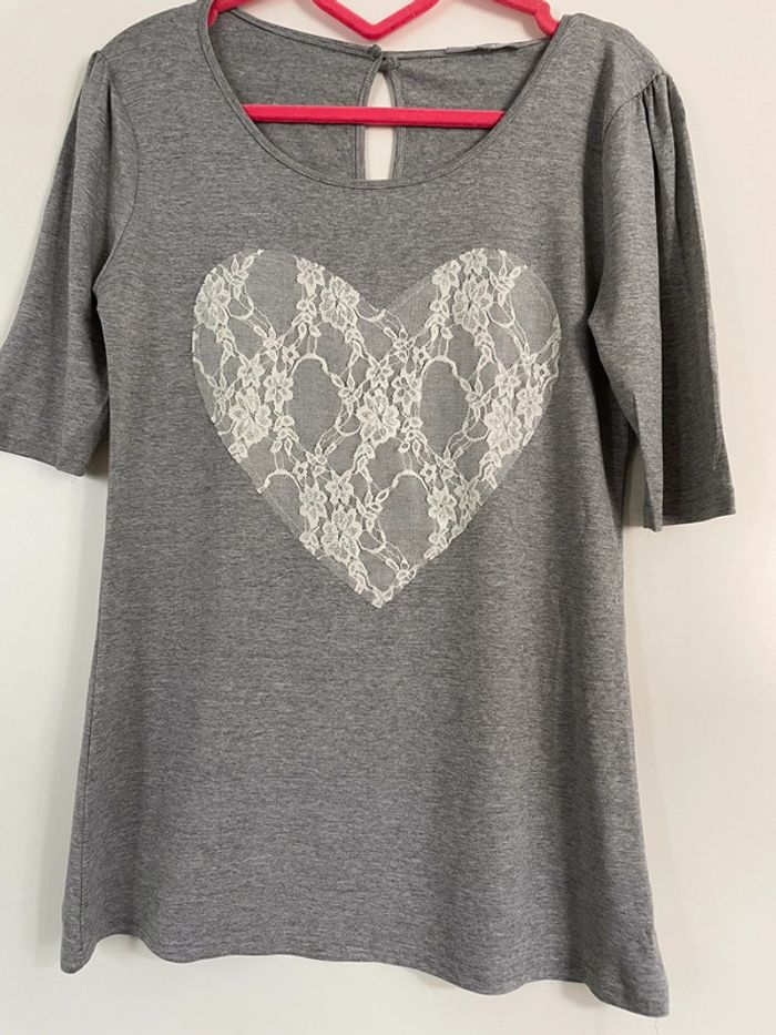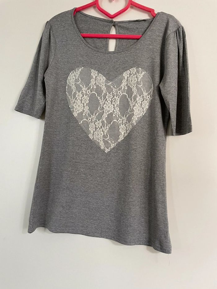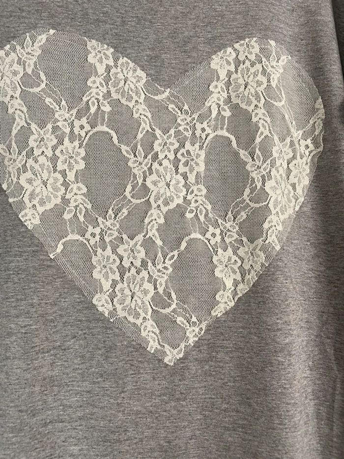 Tee Shirt gris avec cœur en dentelles blanches. Taille XL. #yessiitaille42