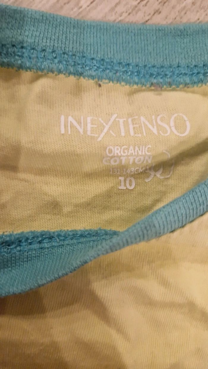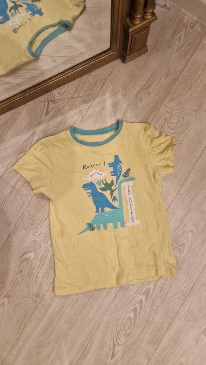 Tee shirt manches courtes jaunes avec motif dinosaures, bord du col vert. Très sympa pour les fans de jurassik et des dino en général. Enfilage par la tête, confortable. Taille 10 ans de chez In Extenso. #dinosaures #trex #garcon10ans #inextenso