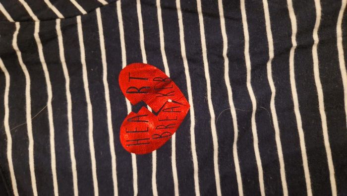 Ensemble comprenant un tee shirt manches longue style marinière bleu marine rayé blanc et imprimé sur la poitrine en rouge métallique. Enfilage par la tête de chez Kiabi. Et un tregging bleu foncé. Extensible. Taille élastique et ajustable. Vraiment confortable. De chez Okaïdi. Taille 8 ans.