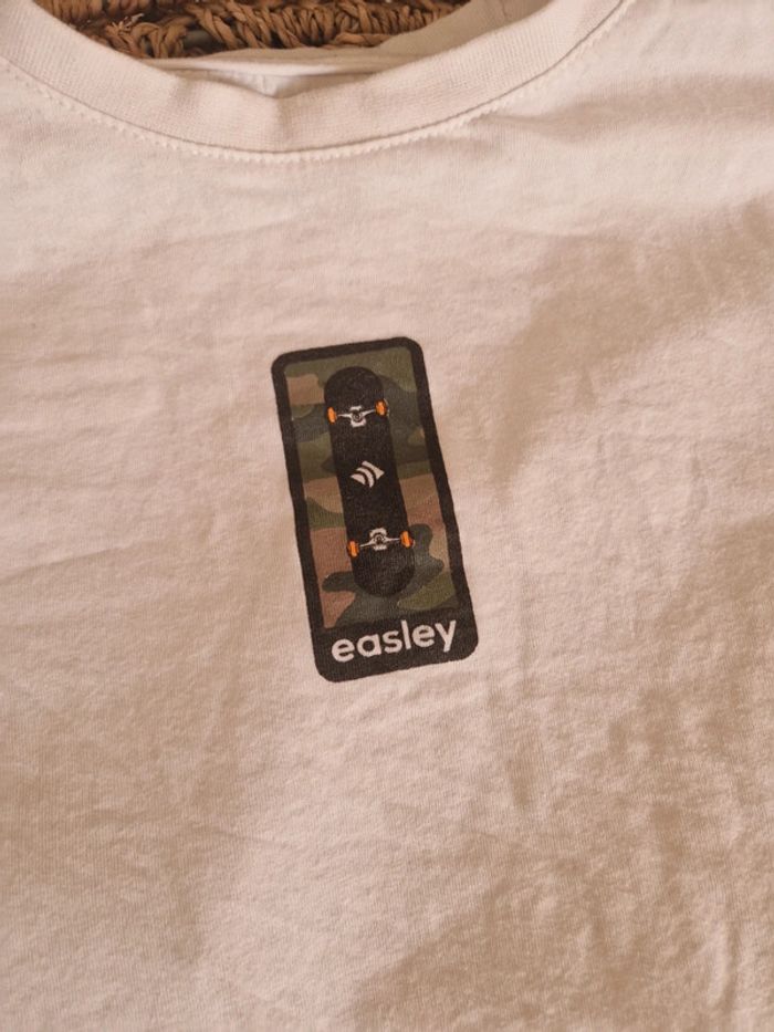 Tee shirt manches longues blanc avec imprimé skate easley. Confortable, simple et efficace. Peu se porter seul ou sous une chemise ouverte. Taille XXS équivalent à du 12 ans. De chez Kiabi. #garconxxs #kiabi #dressingdetristan12ans #tshirtxxs
