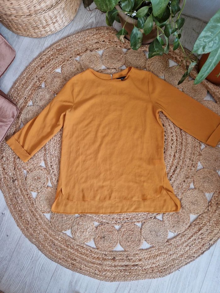 Chemisier fin / léger chic, classe, de couleur moutarde avec une fermeture dans le dos pour faciliter l'enfilage par la tête. Manches 3/4. Vraiment confortable à porter. Idéal pour une tenue de fête ou pour entretien. Taille 36 de chez Primark. #primark #primarkfemme36 #chemisierfemme36 #femme36 #chemisierchic36