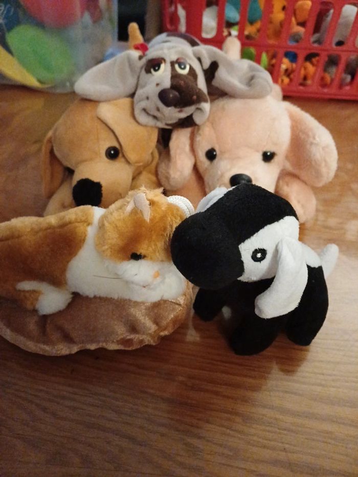 Lot de 5 peluches, chiens et chat