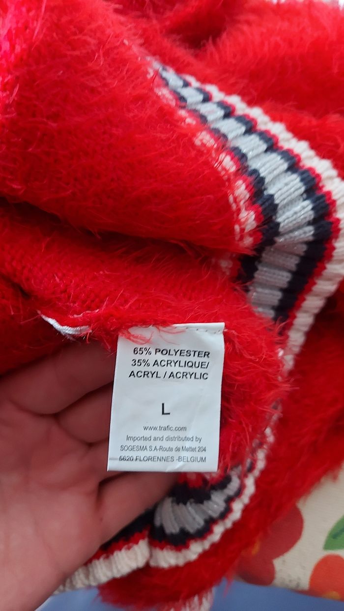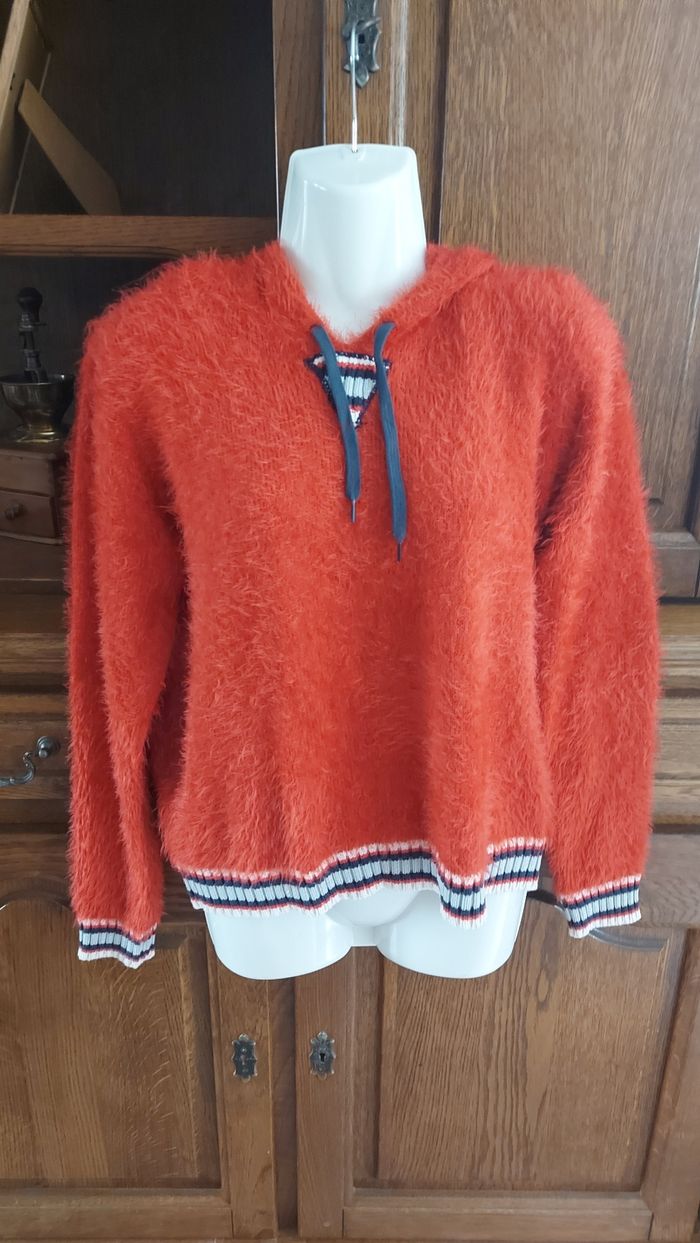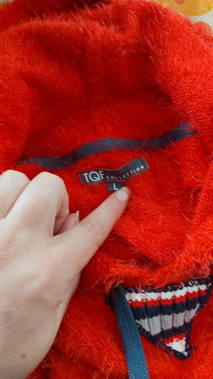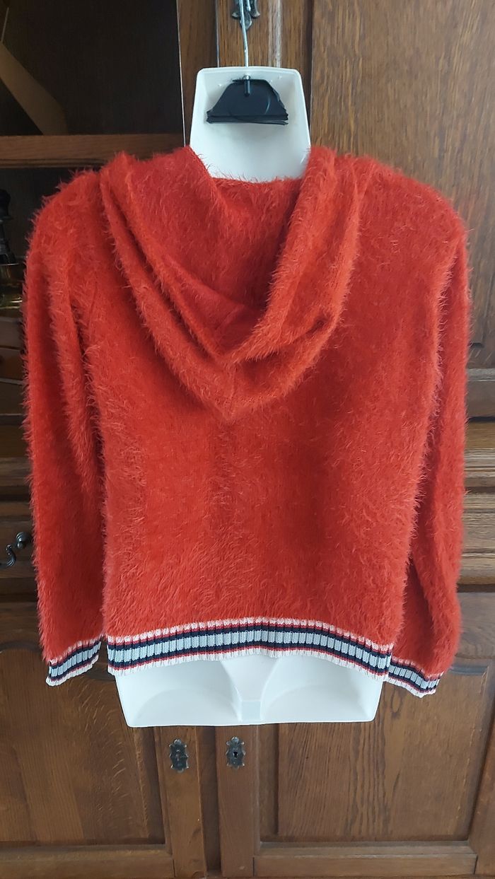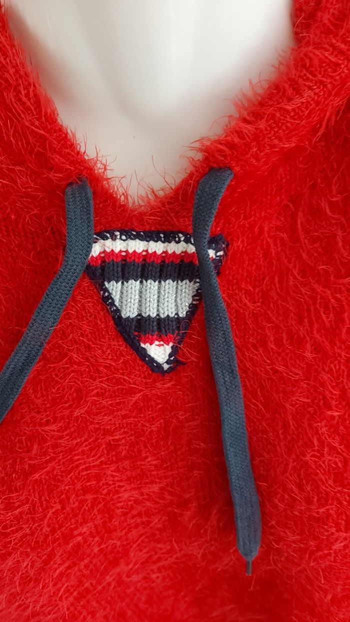 Sweet à capuche rouge, matière poils doux, TQF, taille L Sous-bras 55 cm, Longueur 59 cm