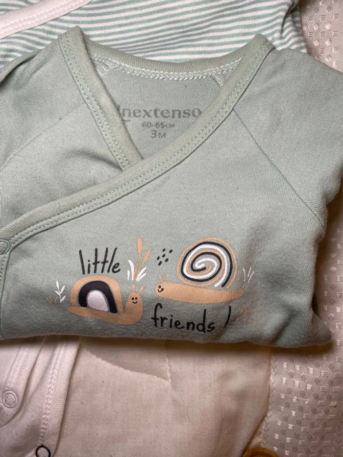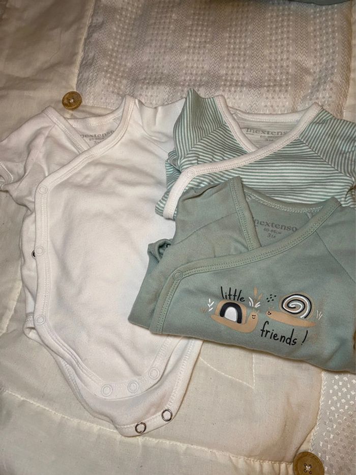 Lot de 3 bodies bébé en taille 3 mois de Inextenso de Auchan . Très bon état un blanc un rayé vert et un vert amande