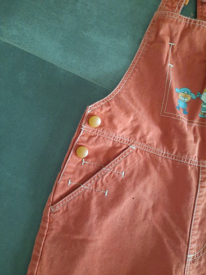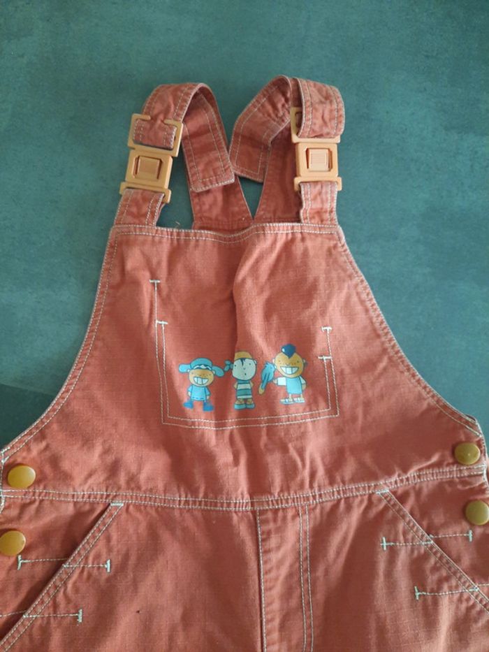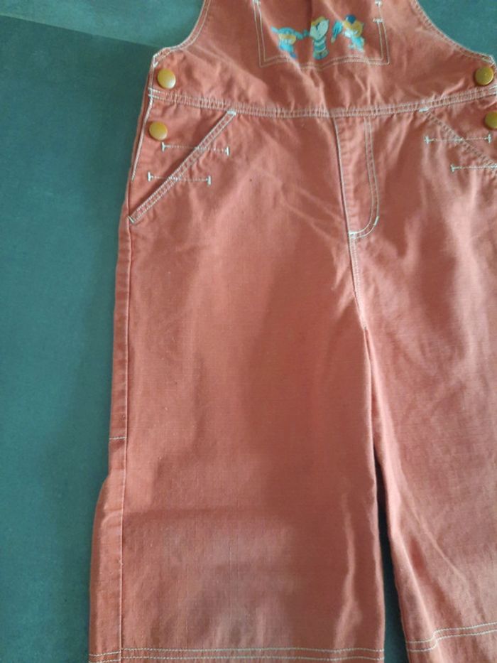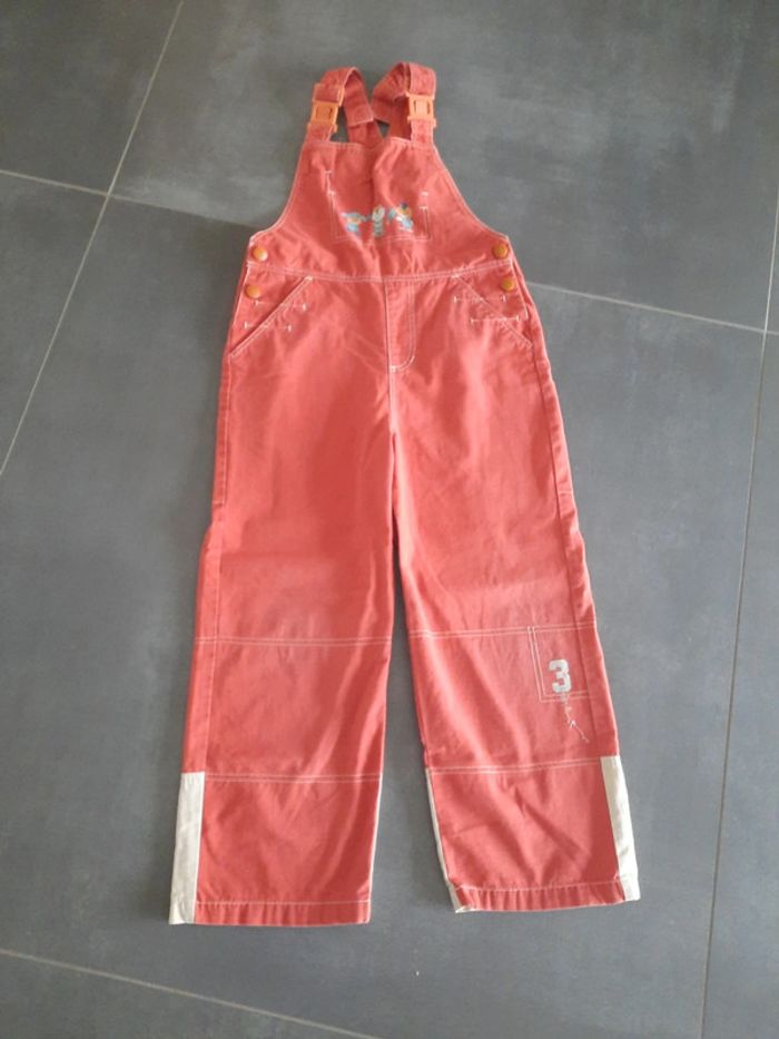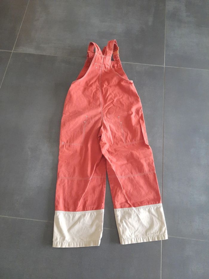 Salopette 6 ans couleur rouge brique et crème. Jolis motifs. Un peu blanchi usé aux genoux.