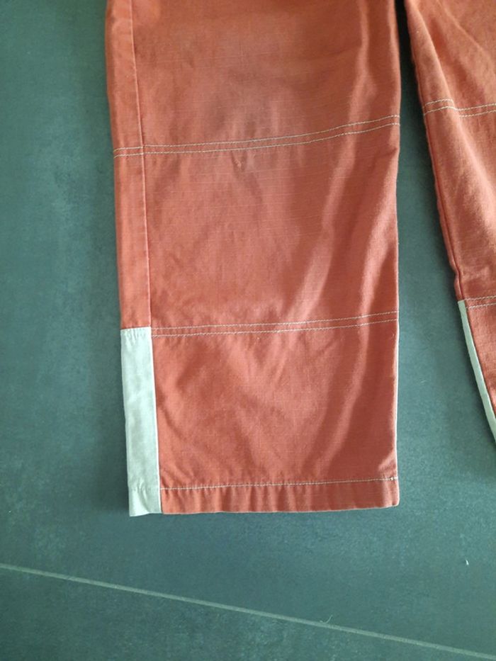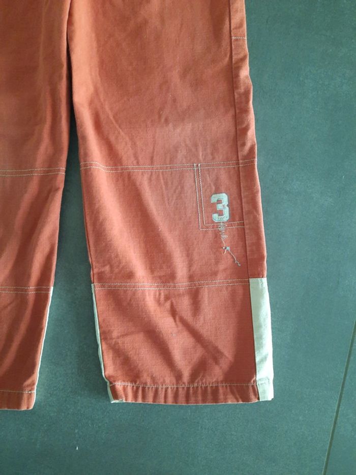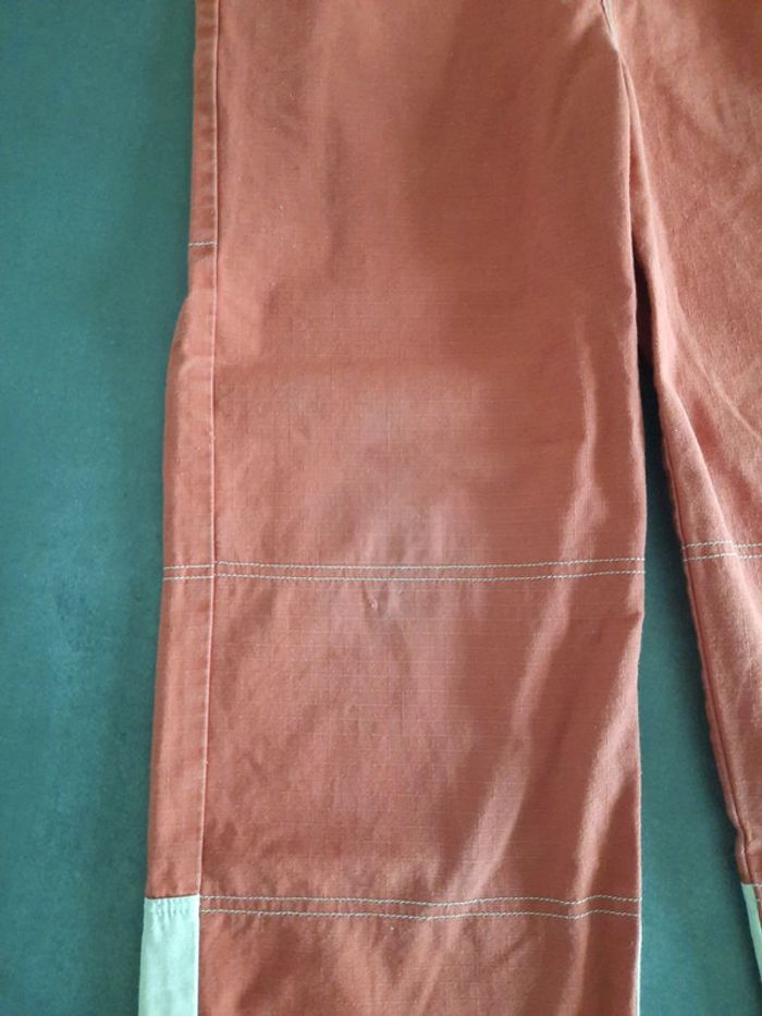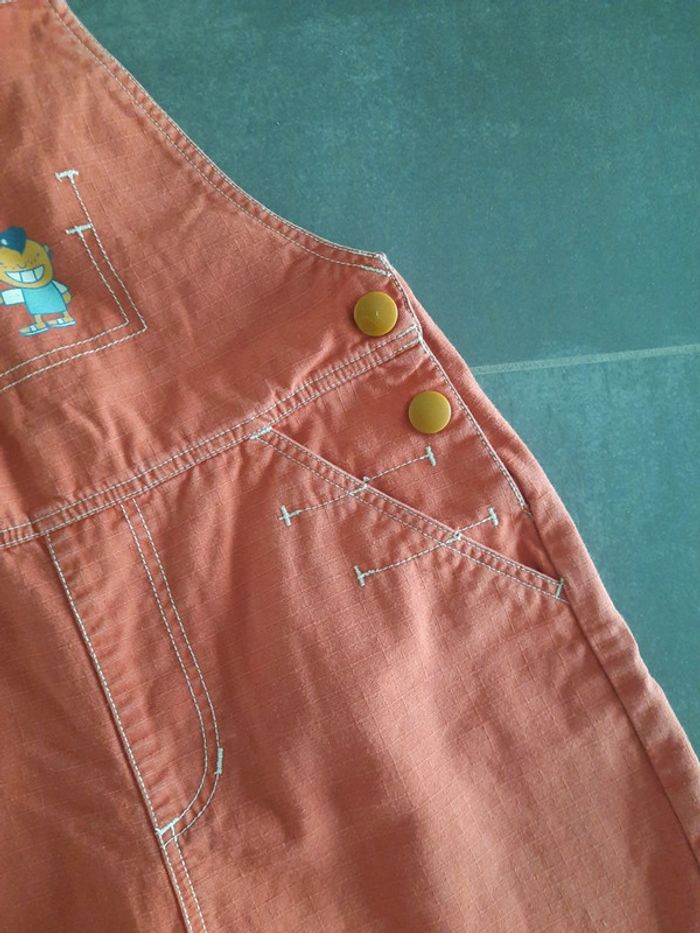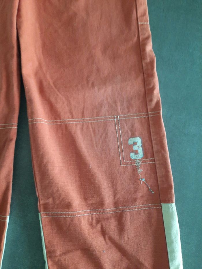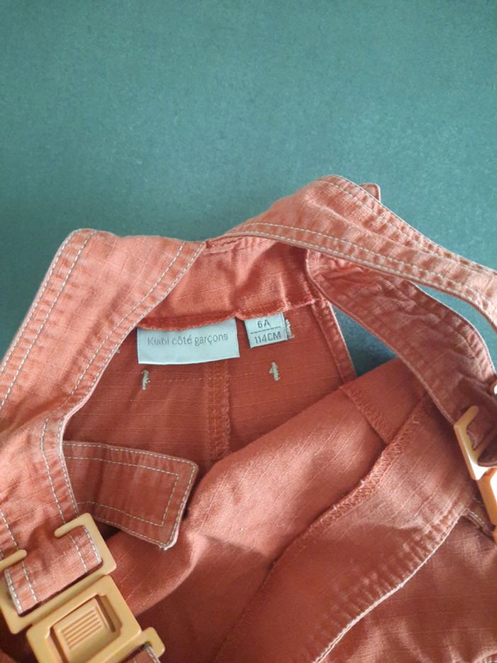 Salopette 6 ans couleur rouge brique et crème. Jolis motifs. Un peu blanchi usé aux genoux.