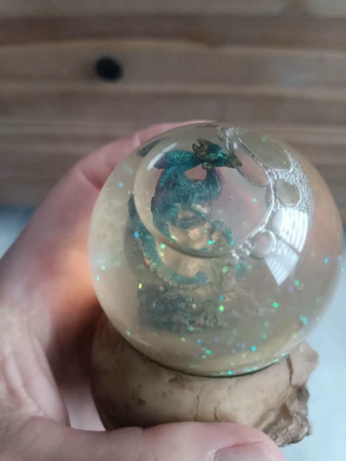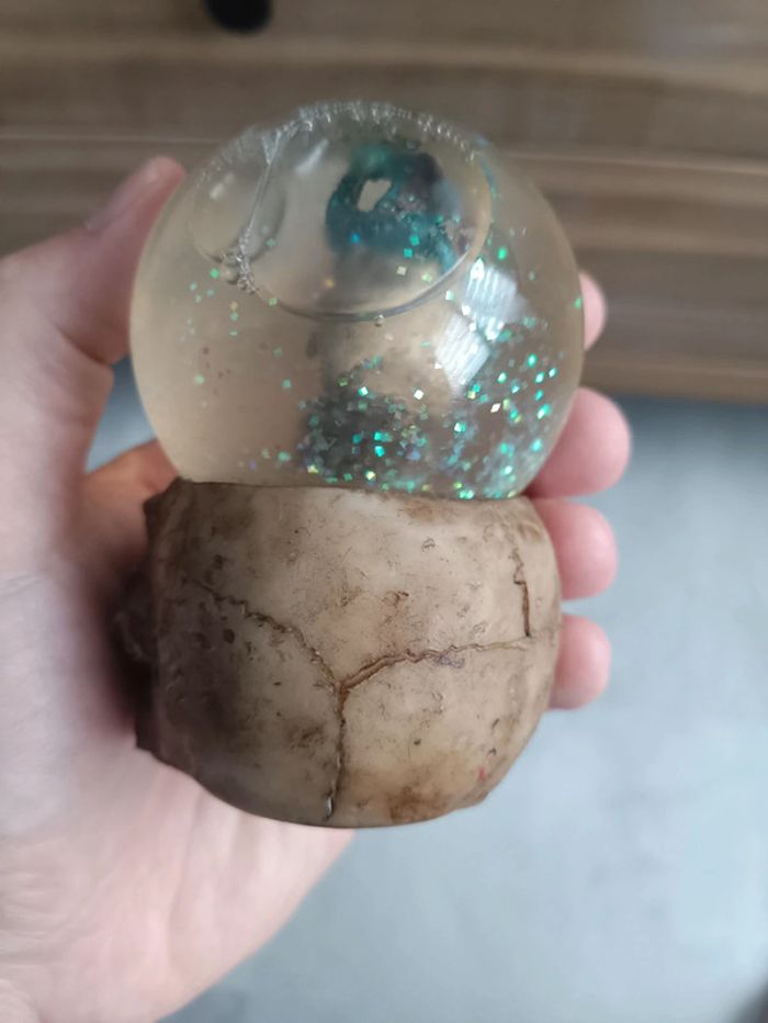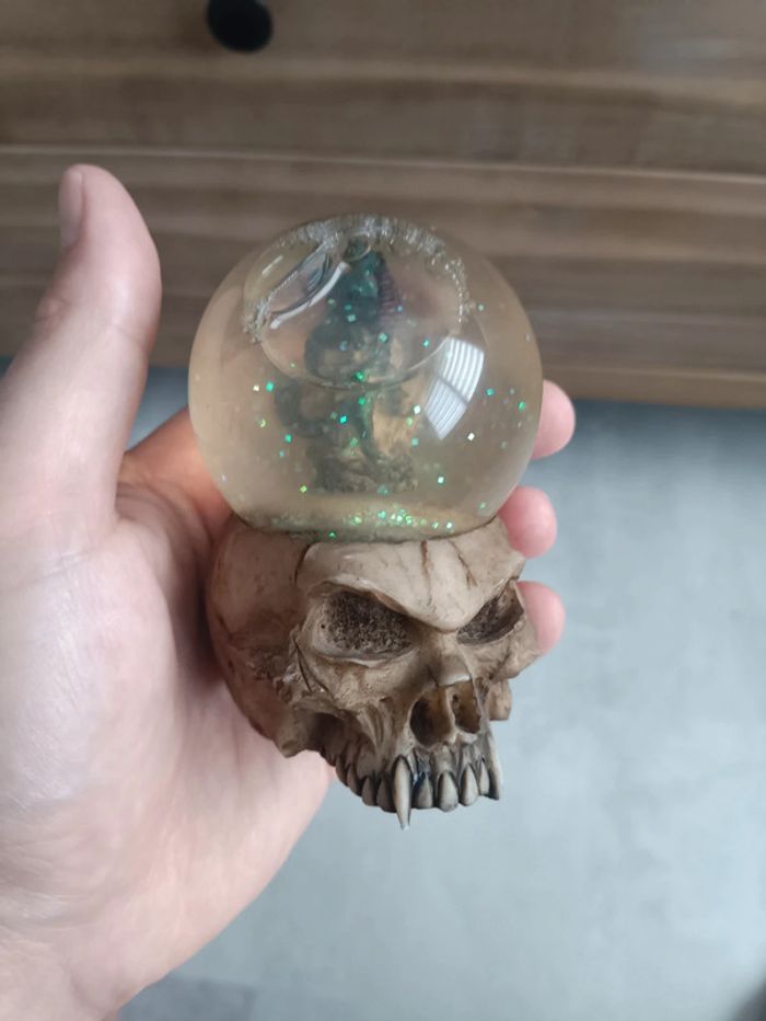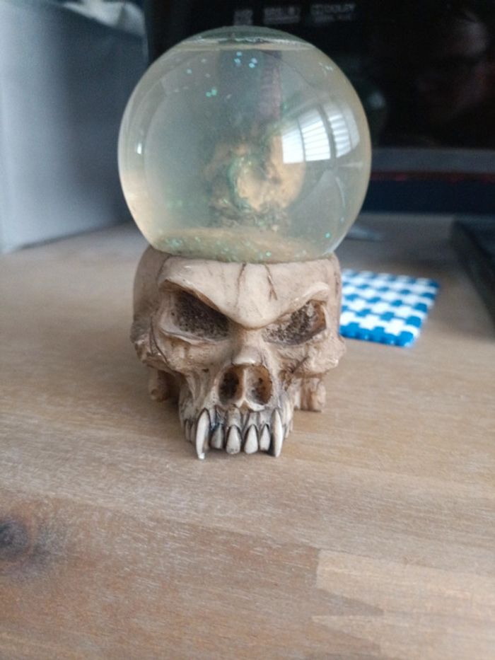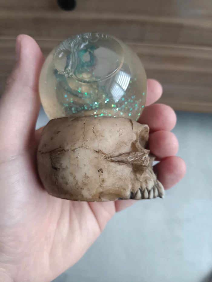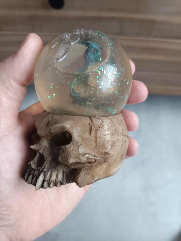 Figurine de crâne avec boule contenant un crâne surmonté d'un dragon.