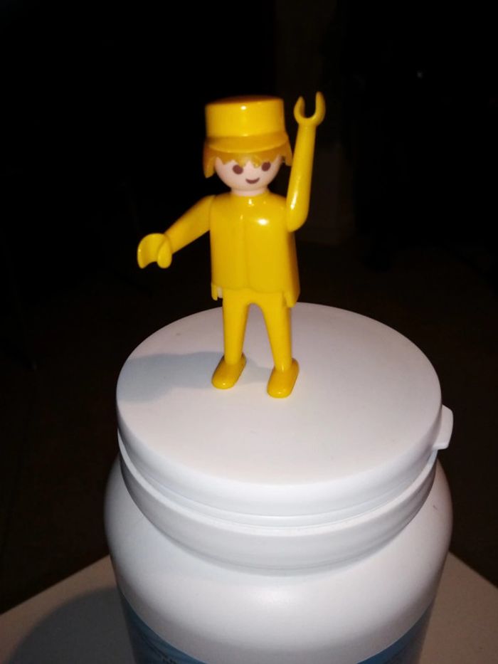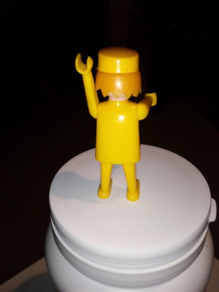 Personnage Playmobil avec casquette vintage 1974, cheveux un peu abîmé.