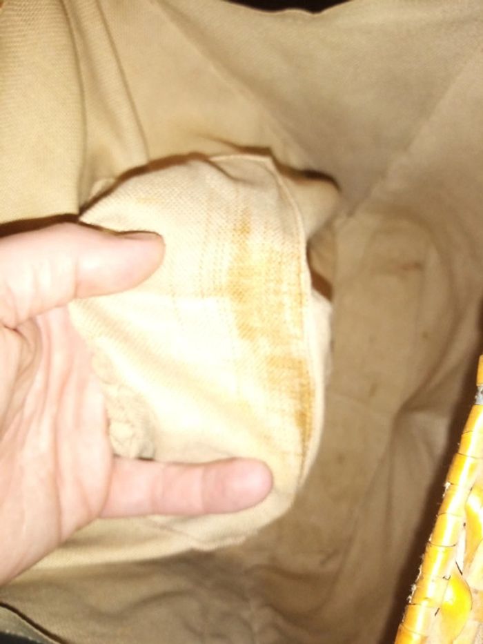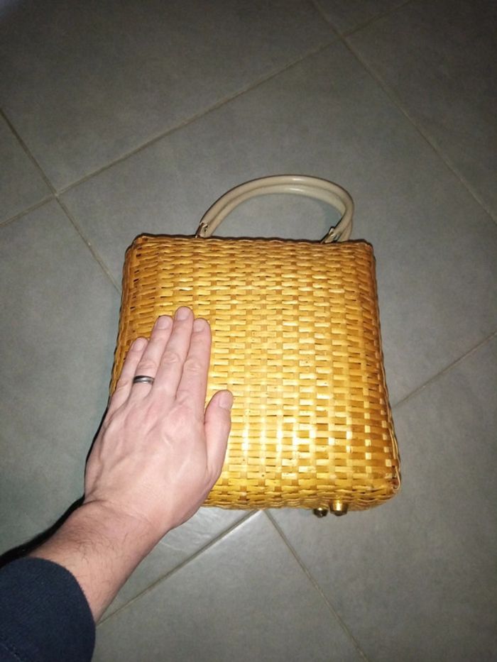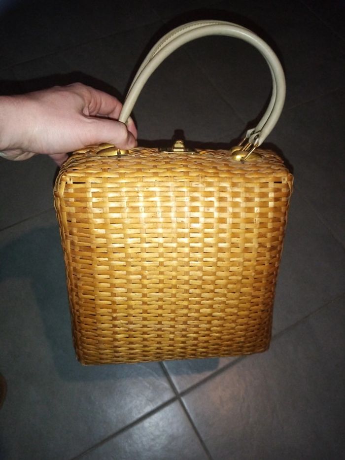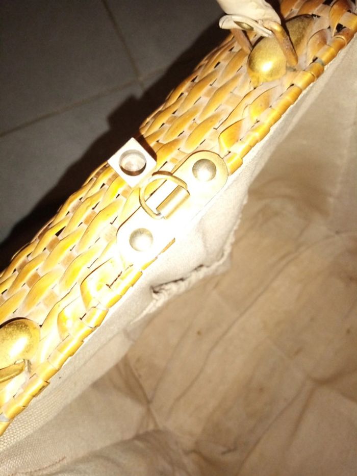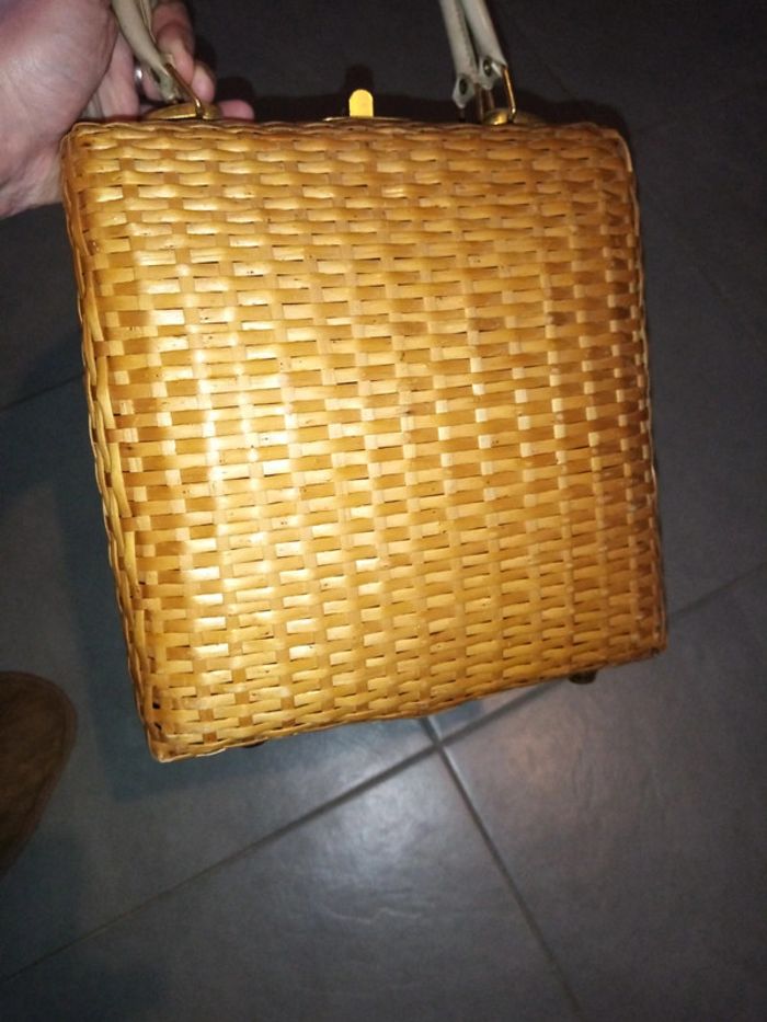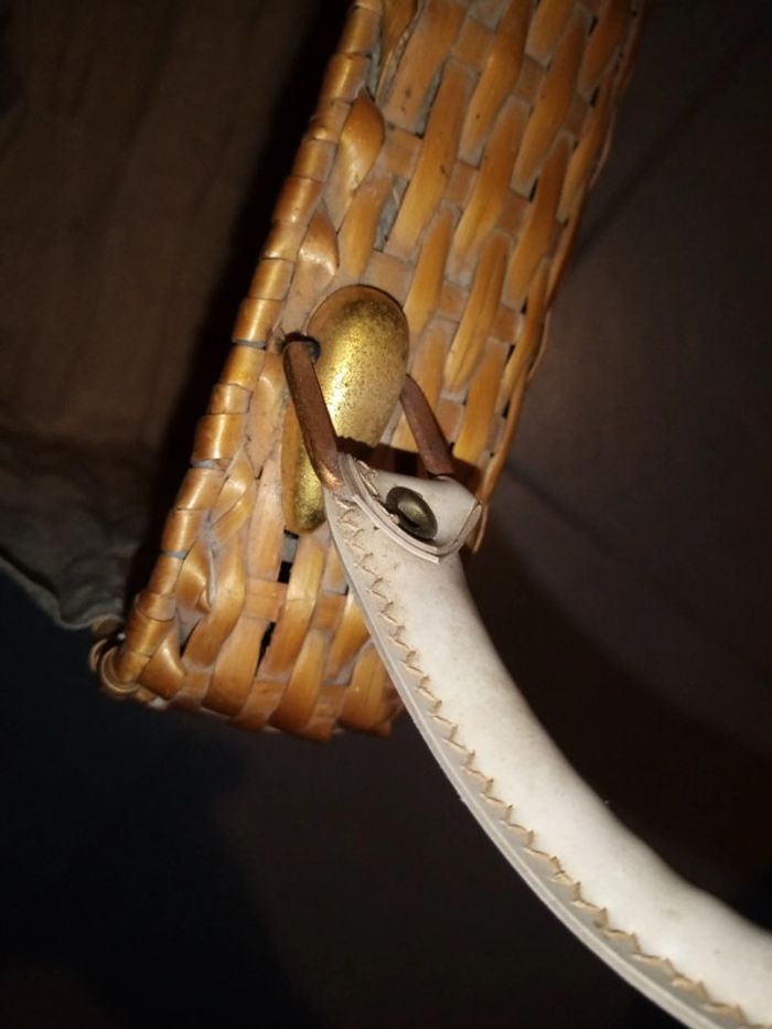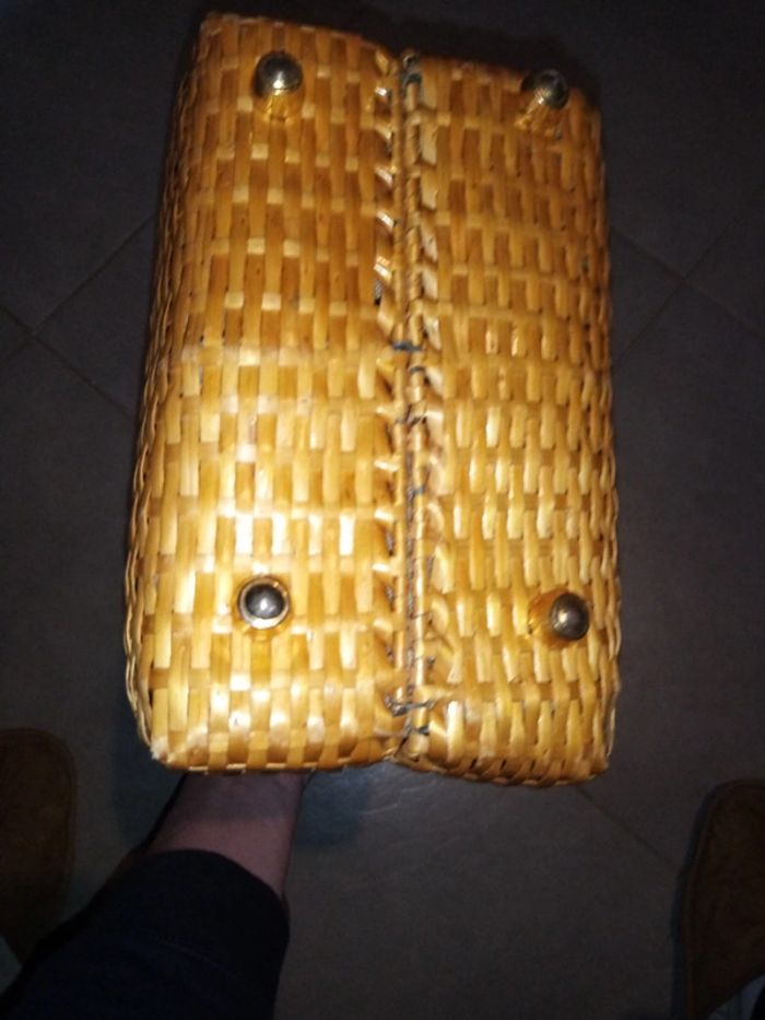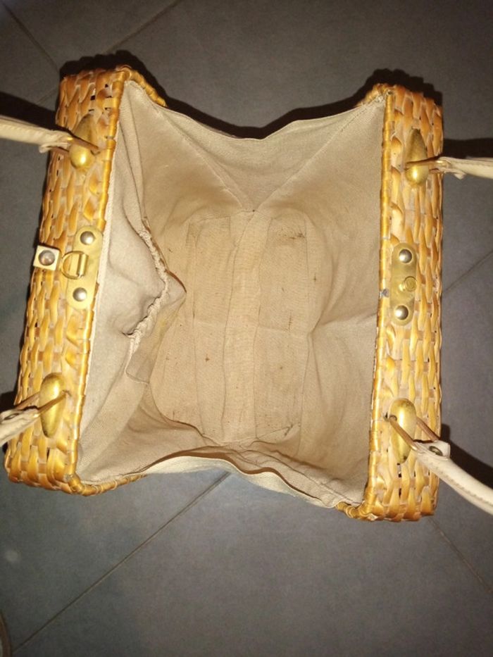 Grand sac vintage en osier, en bon état général. Intérieur en tissu, style jute, un peu fatigué (quelques taches), partie en métal un peu piqué. #sacvintage #70 #seventies #grandsacamain #original #sacàmain #sacenbois #sacancien