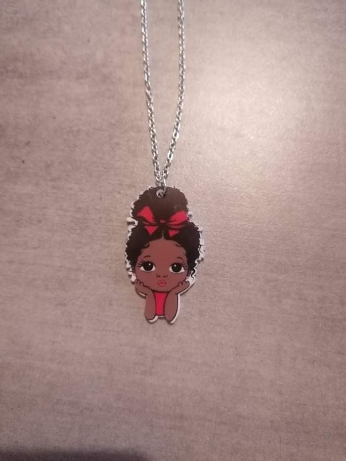 Collier argenté de 45cm environ jamais porté (donc neuf) représentant une petite fille