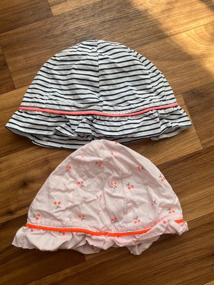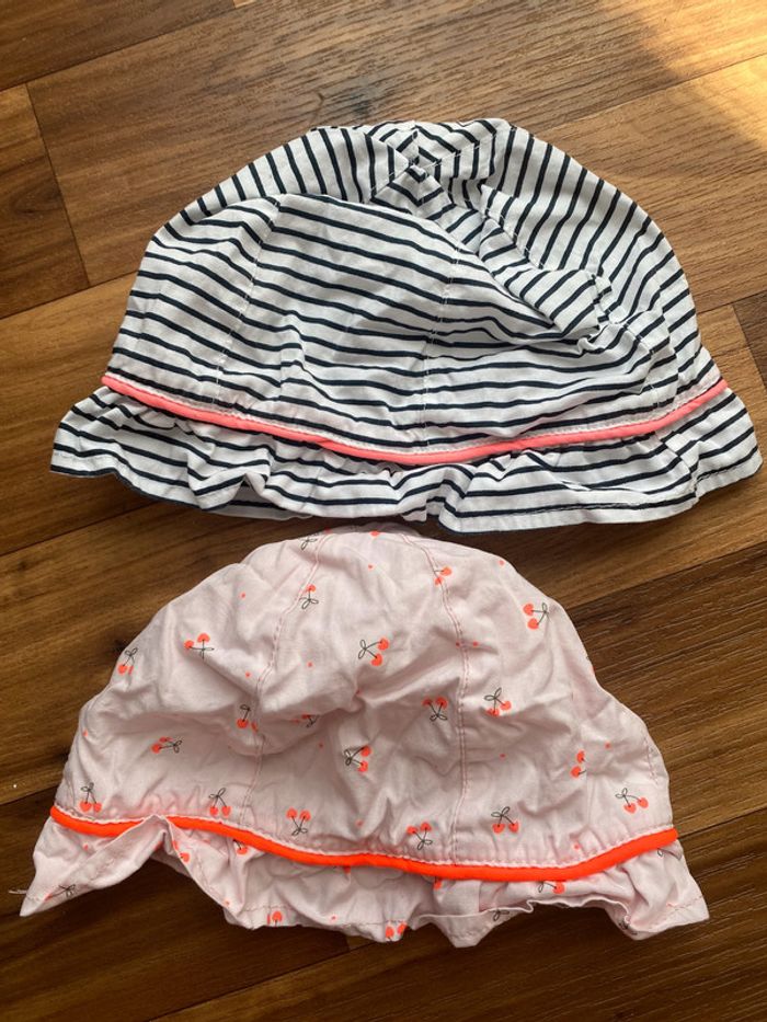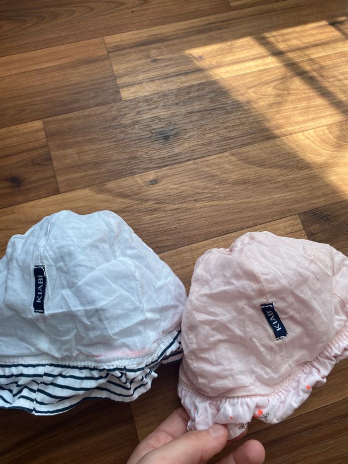 2 chapeaux filles Kiabi Très peu porté. Le rayé correspond à un 6/12mois. Le rose est un peu plus petit