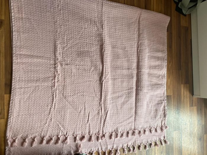 Acheté en déco à l’époque pour la chambre de bébé Rose poudré Un côté frange, un côté un peu serviette Environ 2 m *1,5m