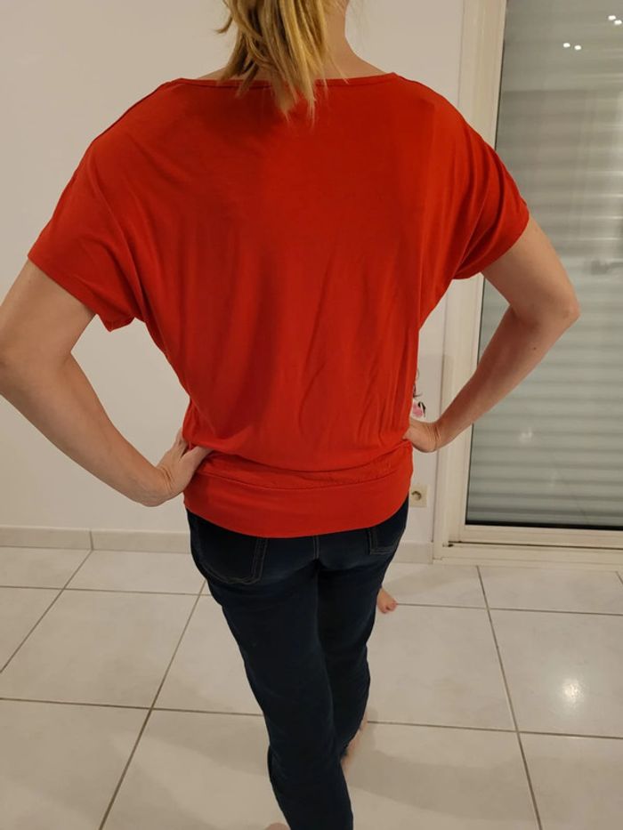 Tee-shirt orange bande resserrée en bas, effet blousant. N hésitez pas à découvrir les autres articles de mon dressing! 😉