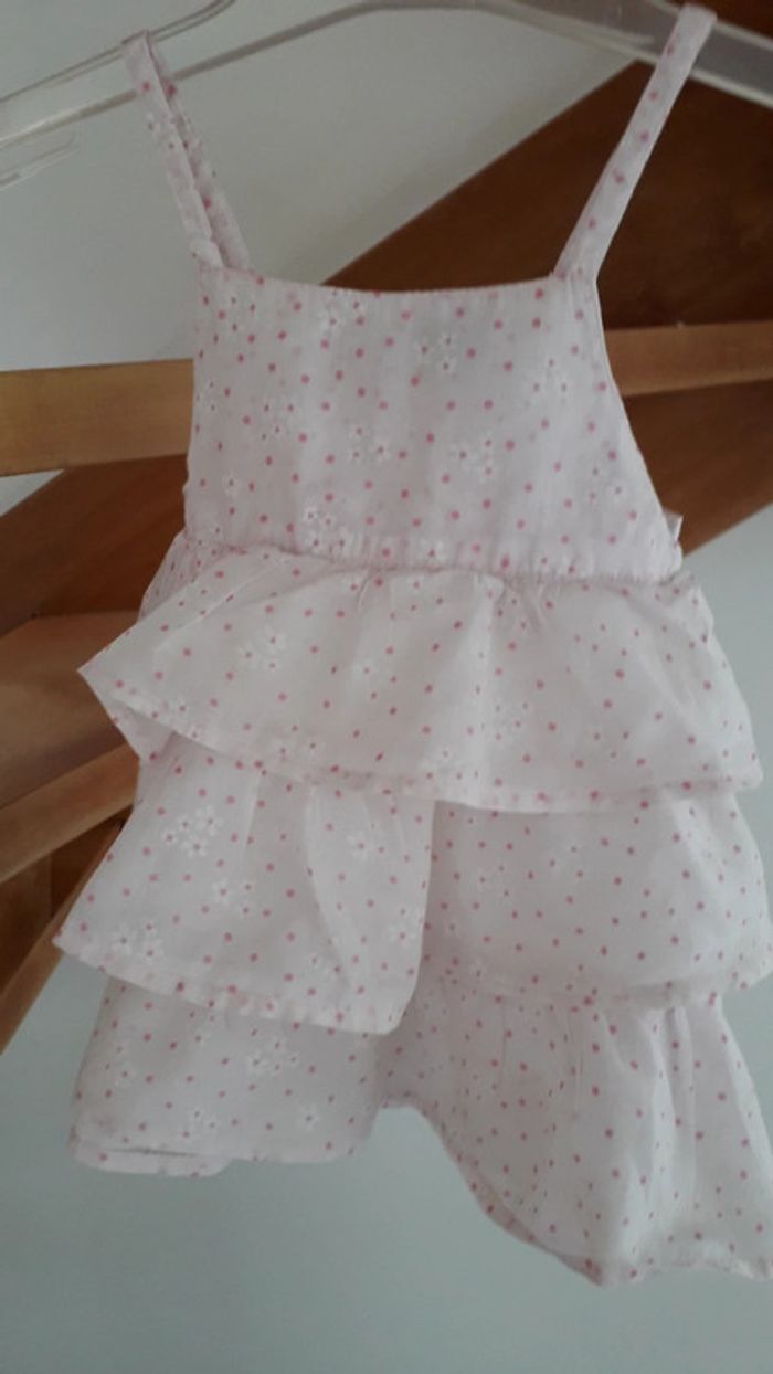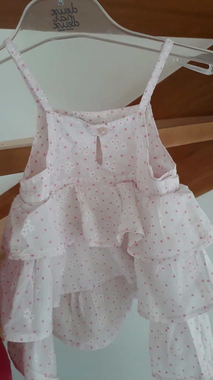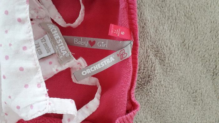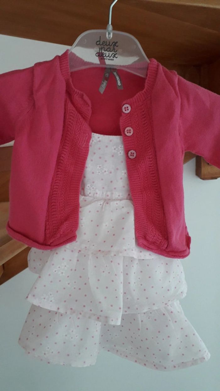 Une tunique volanté rose imprimé fleurs et pois taille 12 mois mais taille plutôt 9mois Un gilet rose fuschia coordonné 6 mois. N hésitez pas à découvrir les autres articles de mon dressing! 😉