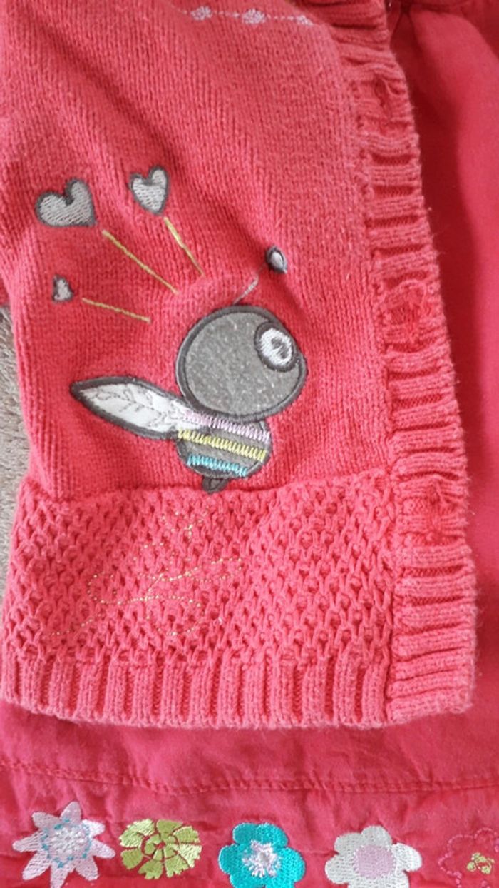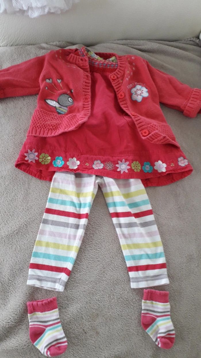 Une jolie tenue contenant 5 articles! une robe facile à enfiler grâce aux pressions dans le dos, un gilet, un legging et 2 paires de chaussette coordonnées. Taille 6mois N hésitez pas à découvrir les autres articles de mon dressing! 😉