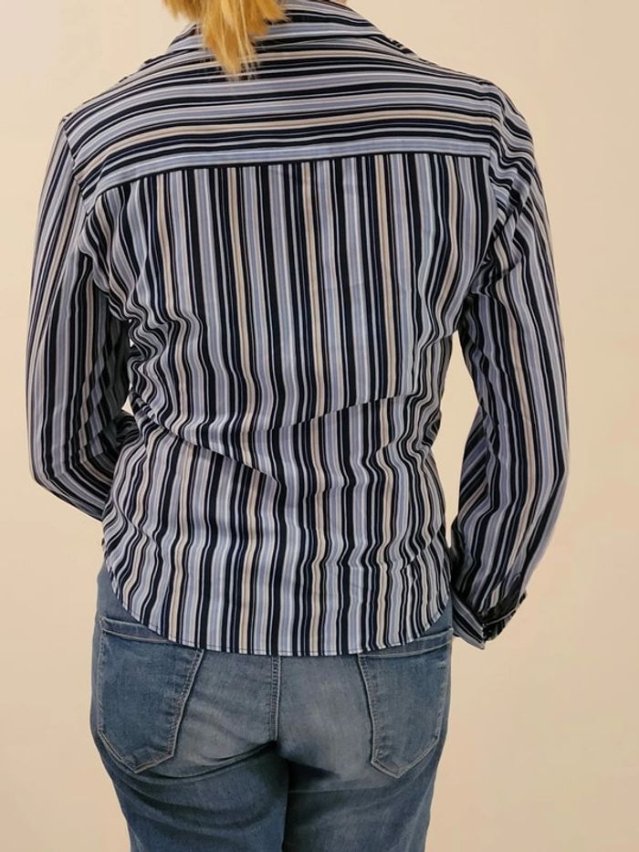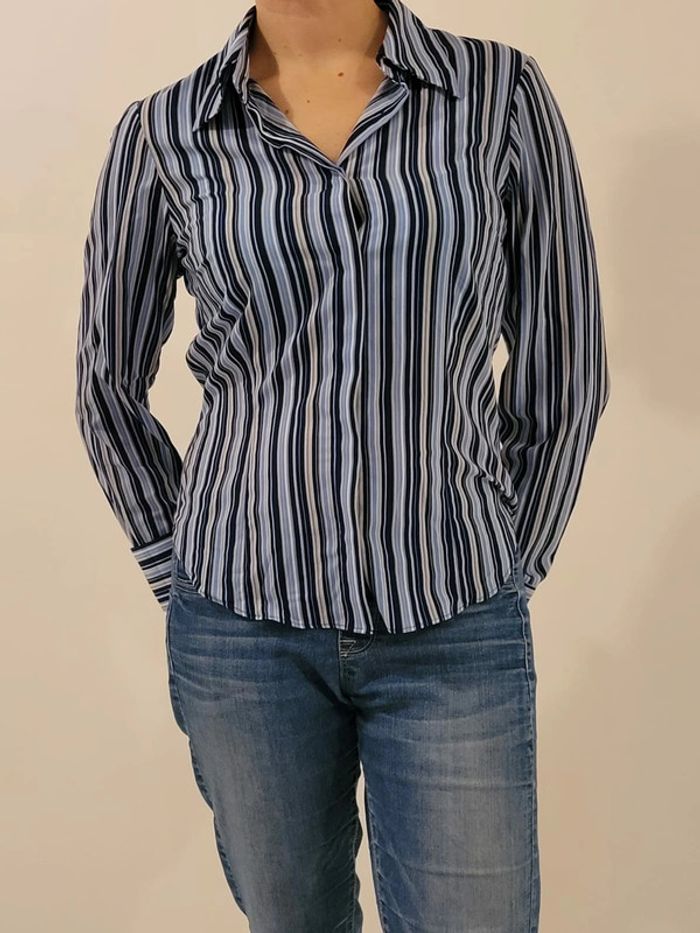Très pratique car pas besoin de repassage! Cette chemise est rayée bleu. Elle est fluide et agréable à porter. En parfait état. Taille 38. N hésitez pas à découvrir les autres articles de mon dressing! 😉