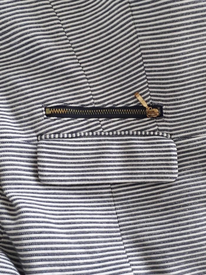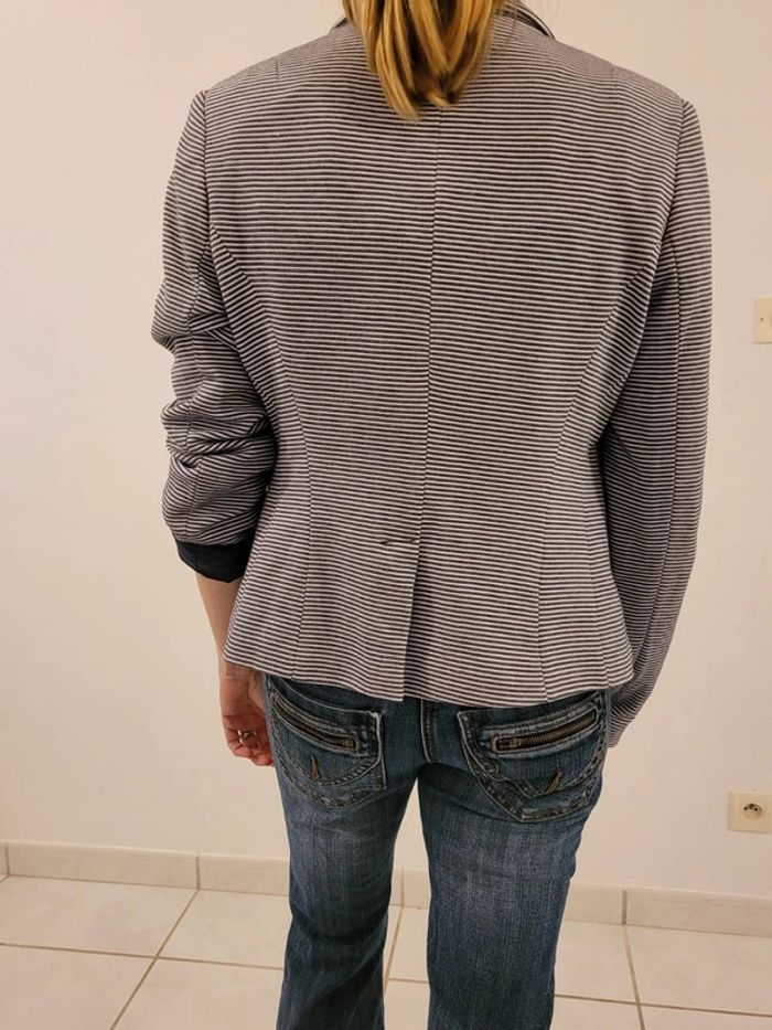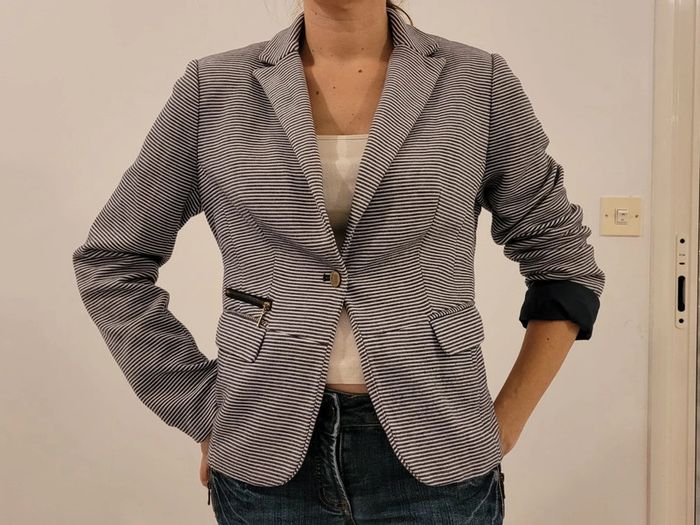 Veste cintrée rayée bleu Marine et blanc, col tailleur. Poche sur le côté plus un zip décoratif . (Voir photos) Dimension épaule 40cm. Longueur 55cm Elle est quasi neuve! N hésitez pas à découvrir les autres articles de mon dressing! 😉
